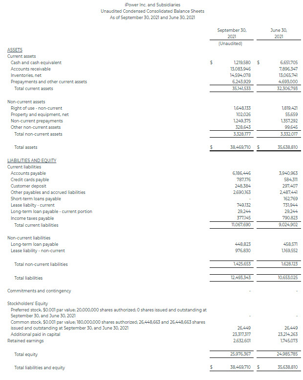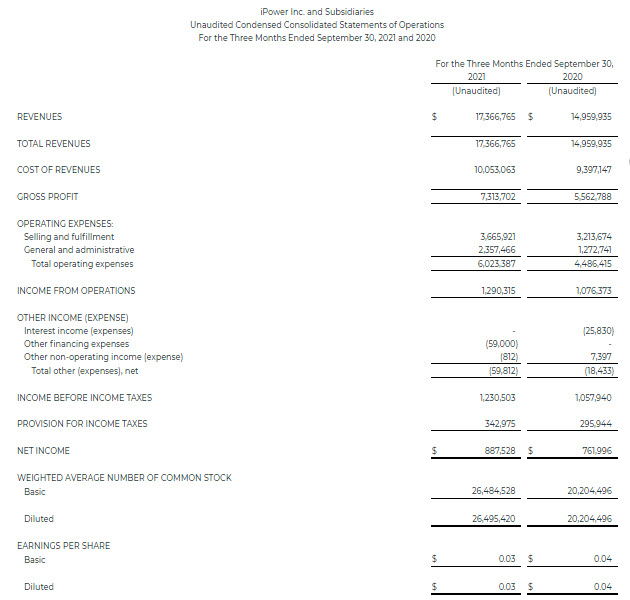 DUARTE, Calif., Nov. 11, 2021 (GLOBE NEWSWIRE) — iPower Inc. (Nasdaq:IPW) (“iPower” or the “Company”), one of the leading online hydroponic equipment suppliers and retailers in the United States, today announced financial results for its fiscal first quarter ended September 30, 2021.