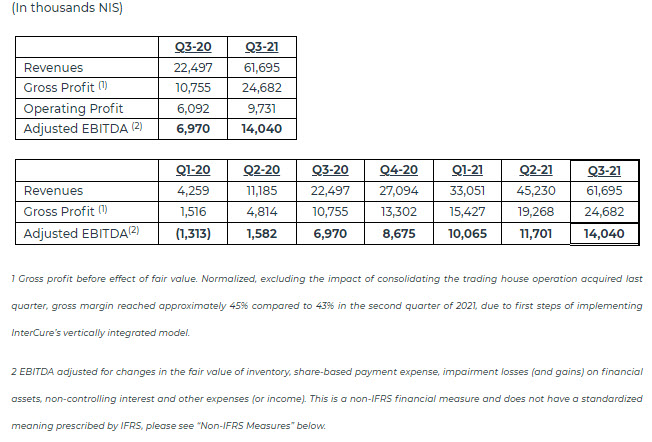 “During the quarter we continue to execute our profitable growth strategy establishing our leadership position, achieving new firsts and new records,” said InterCure’s Chief Executive Officer, Alexander Rabinovitch. “These include, 7 consecutive quarters of high double-digit growth and improved profitability, five consecutive quarters with positive cash flow, crossing the one ton mark in GMP medical cannabis products dispensed monthly, over 70,000 patients served, and achieving an annualized revenues run rate of $100 million, increased gross profits and adjusted EBITDA run rate of $23 million. We expect growth to continue in the fourth quarter and through 2022 as we will continue focusing on executing our profitable growth strategy building long and short-term shareholder value.”
