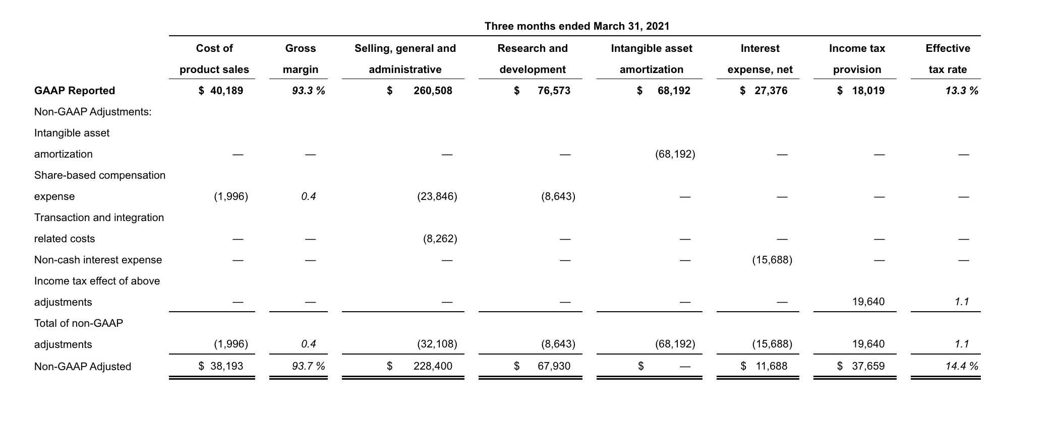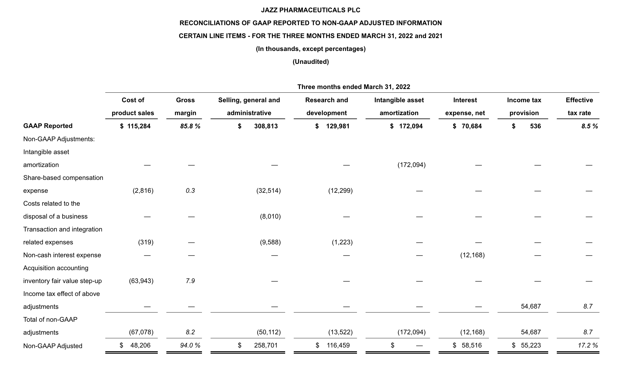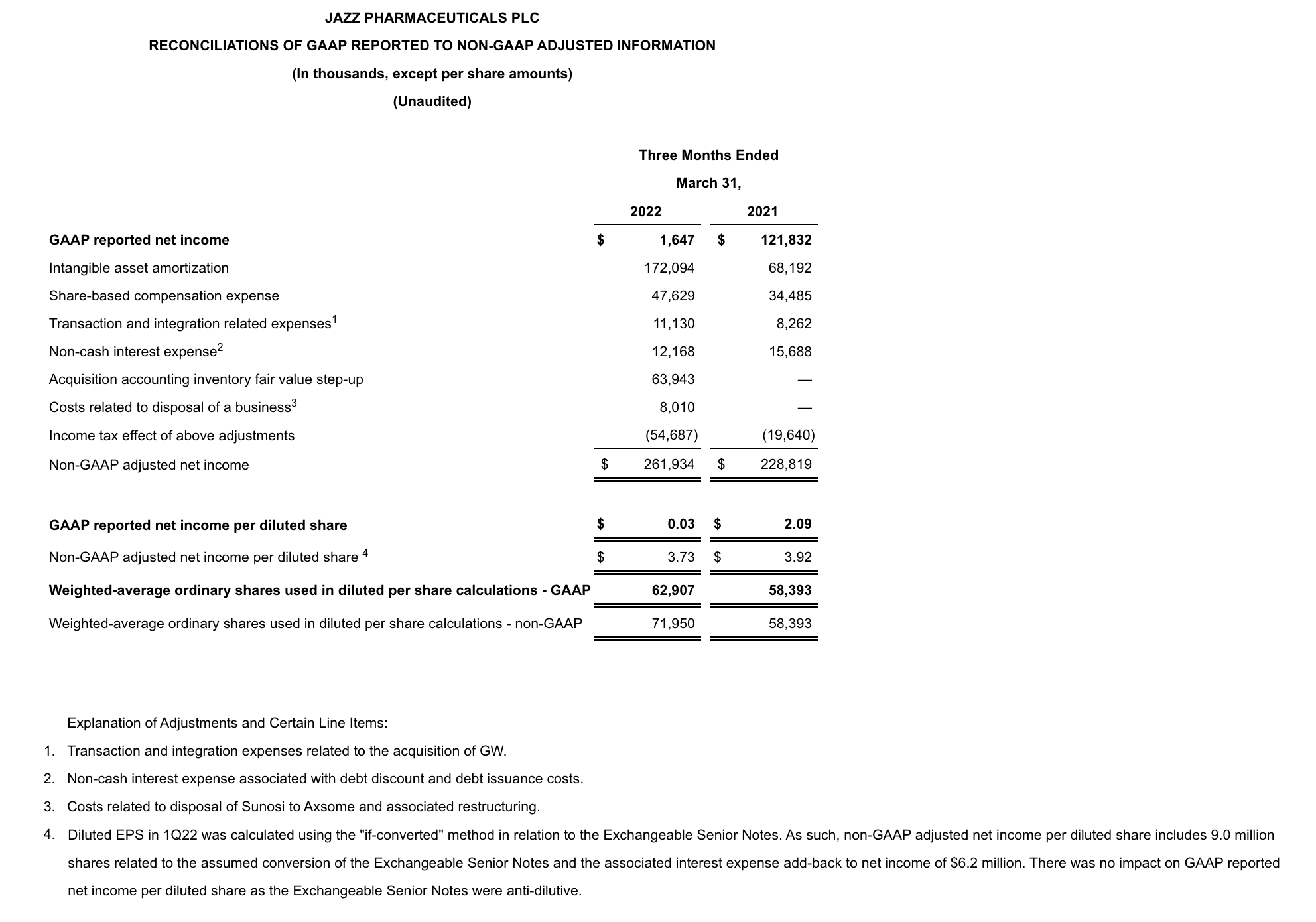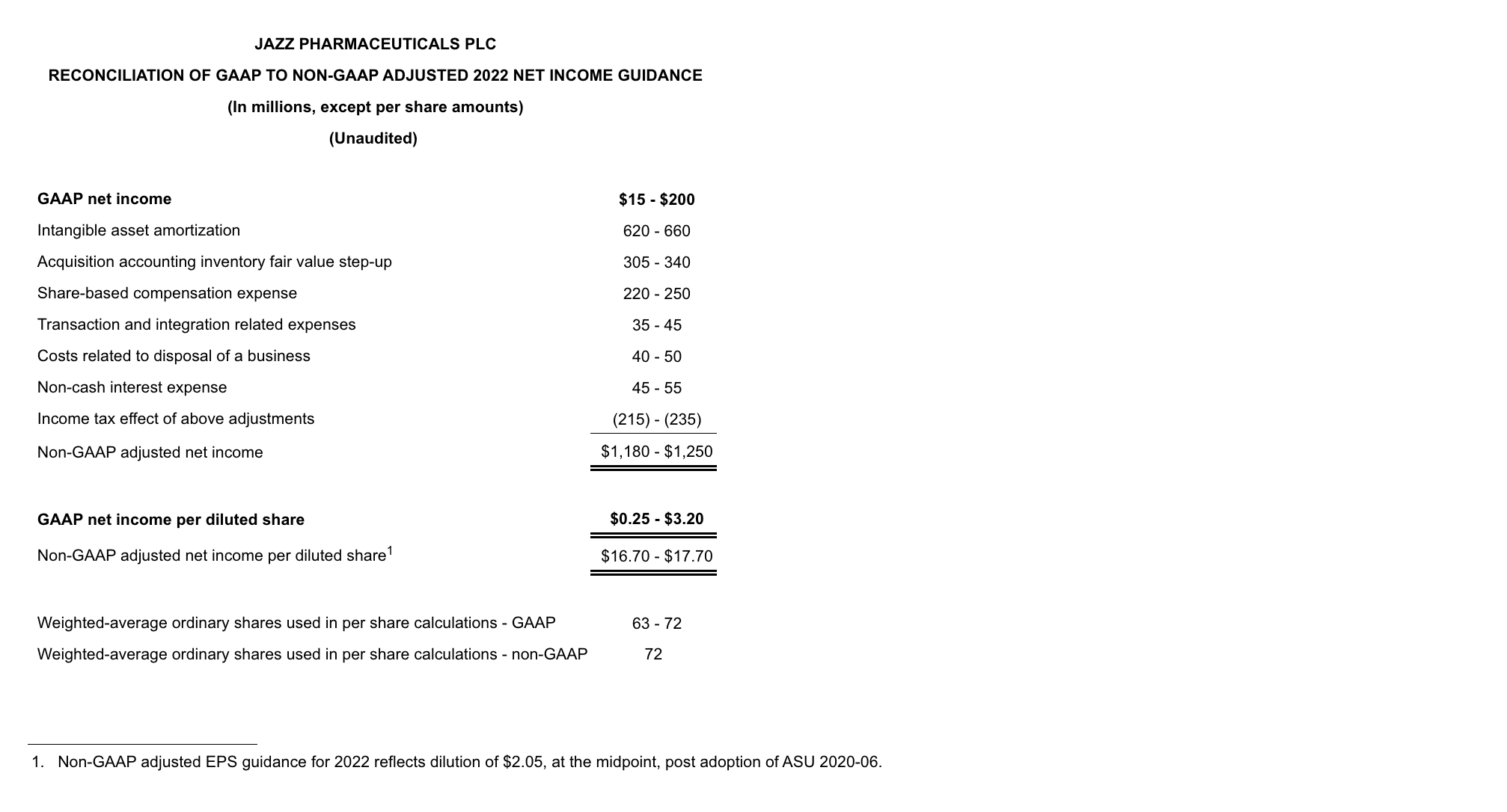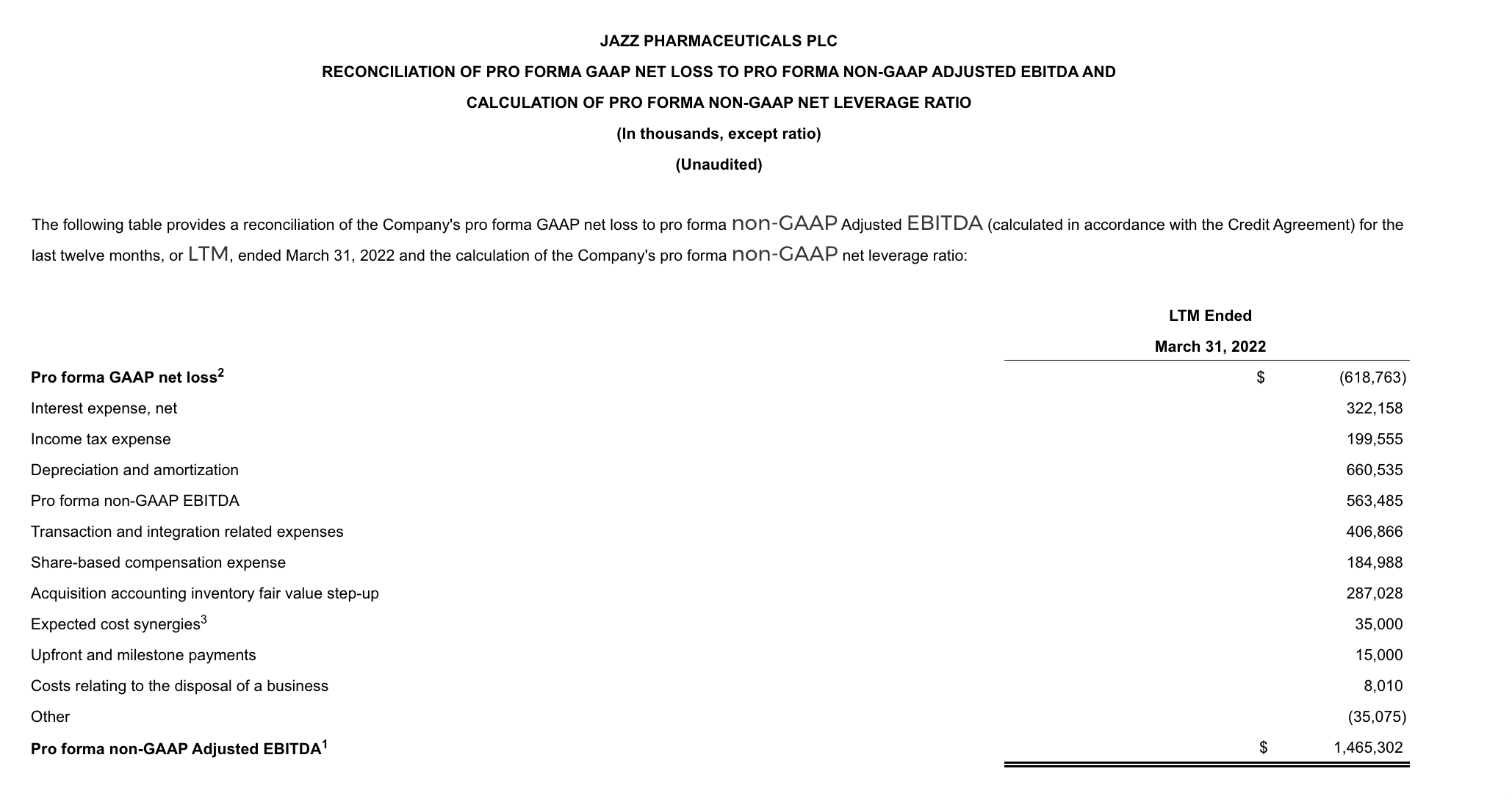 To supplement Jazz Pharmaceuticals’ financial results and guidance presented in accordance with U.S. generally accepted accounting principles (GAAP), the Company uses certain non-GAAP (also referred to as adjusted or non-GAAP adjusted) financial measures in this press release and the accompanying tables. In particular, the Company presents non-GAAP adjusted net income (and the related per share measure) and its line item components, as well as certain non-GAAP adjusted financial measures derived therefrom, including non-GAAP adjusted gross margin percentage and non-GAAP adjusted effective tax rate. Non-GAAP adjusted net income (and the related per share measure) and its line item components exclude from GAAP reported net income (and the related per share measure) and its line item components certain items, as detailed in the reconciliation tables that follow, and in the case of non-GAAP adjusted net income (and the related per share measure), adjust for the income tax effect of the non-GAAP adjustments. In this regard, the components of non-GAAP adjusted net income, including non-GAAP adjusted cost of product sales, SG&A expenses and R&D expenses, are income statement line items prepared on the same basis as, and therefore components of, the overall non-GAAP adjusted net income measure. The Company also uses a pro forma non-GAAP net leverage ratio calculated as net debt (defined as total GAAP debt net of cash and cash equivalents) divided by Adjusted EBITDA for the most recent period of four consecutive completed fiscal quarters. EBITDA is defined as net income (loss) before income taxes, interest expense, depreciation and amortization. Adjusted EBITDA is defined as EBITDA further adjusted to exclude certain other charges and adjustments as detailed in the pro forma non-GAAP net leverage ratio reconciliation table that follows, and is calculated in accordance with the definition of Adjusted Consolidated EBITDA as set out in the Company’s credit agreement entered into in May 2021 (the Credit Agreement). Investors should note that reconciliations of certain forward-looking or projected non-GAAP financial measures to their most comparable GAAP financial measures cannot be provided because the Company cannot do so without unreasonable efforts due to the unavailability of information needed to calculate reconciling items and due to the variability, complexity and limited visibility of comparable GAAP measures and the reconciling items that would be excluded from the non-GAAP financial measures in the future. Specifically, reconciliations of the components of projected pro forma non-GAAP net leverage ratio to their most comparable GAAP financial measures is not provided because the quantification of projected GAAP total debt and the reconciling items between projected non-GAAP net adjusted debt and projected GAAP total debt cannot be reasonably calculated or predicted at this time without unreasonable efforts. Such unavailable information could be significant such that actual GAAP total debt net of cash and cash equivalents would vary significantly from projected non-GAAP net adjusted debt used to calculate projected pro forma non-GAAP net leverage ratio.