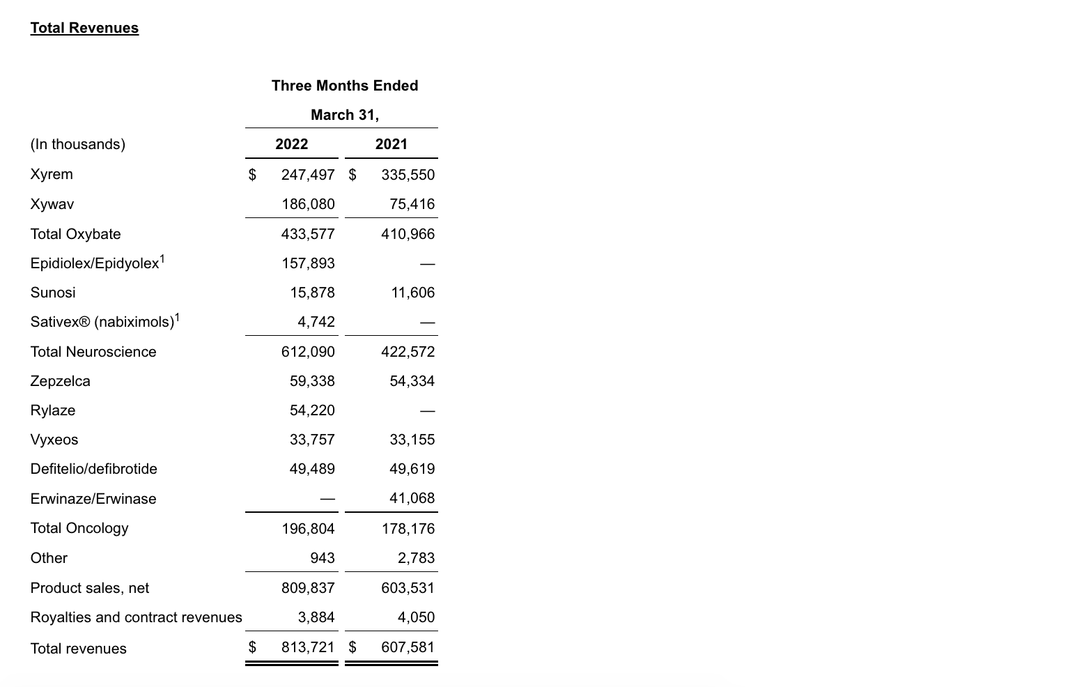 - Net product sales for the combined oxybate business increased 6% to $433.6 million in 1Q22 compared to the same period in 2021.