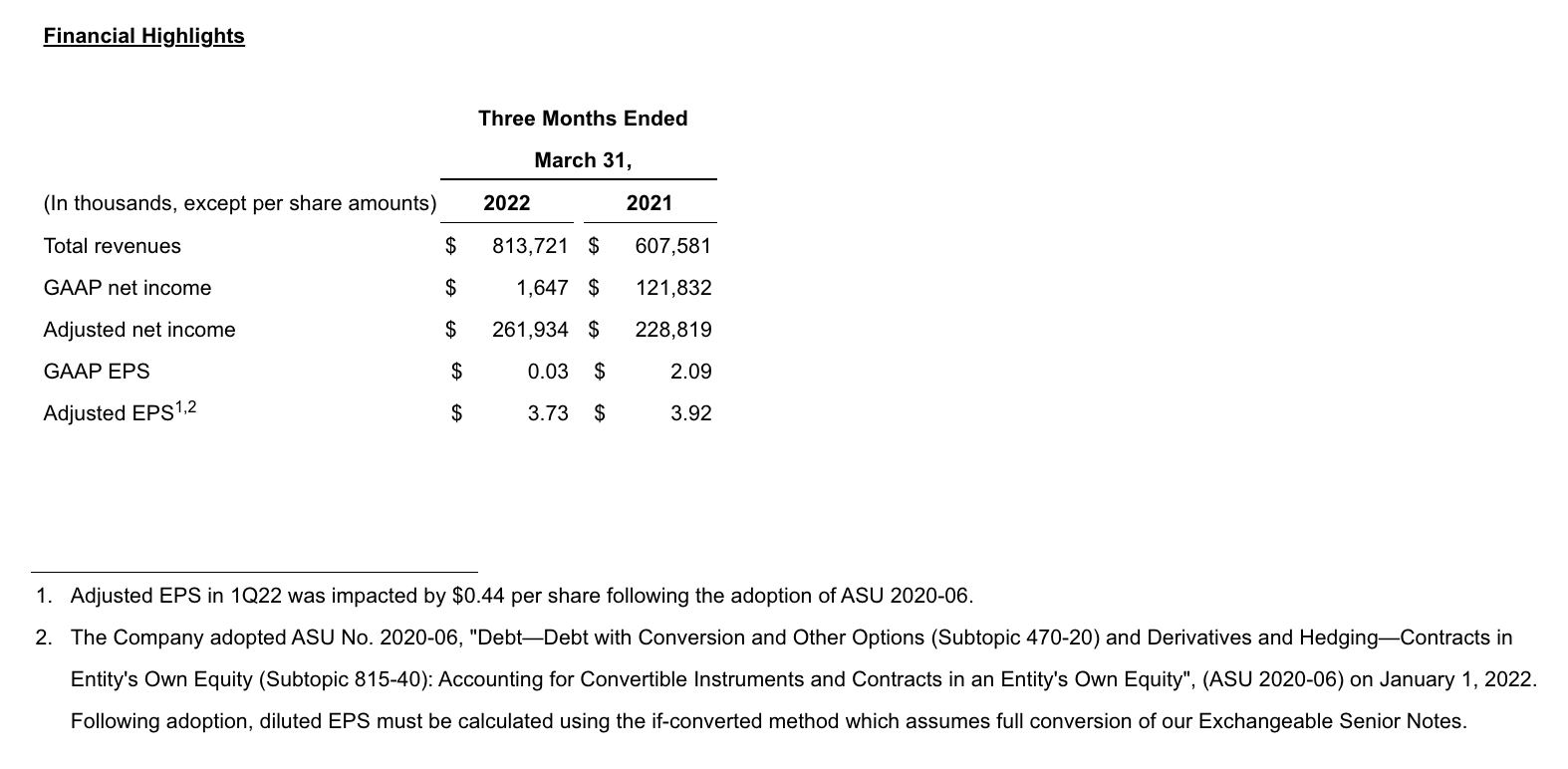 GAAP net income in 1Q22 was $1.6 million, or $0.03 per diluted share, compared to $121.8 million, or $2.09 per diluted share, for 1Q22. Non-GAAP adjusted net income in 1Q22 was $261.9 million, or $3.73 per diluted share, compared to $228.8 million, or $3.92 per diluted share, for 1Q22. Reconciliations of applicable GAAP reported to non-GAAP adjusted information are included at the end of this press release.