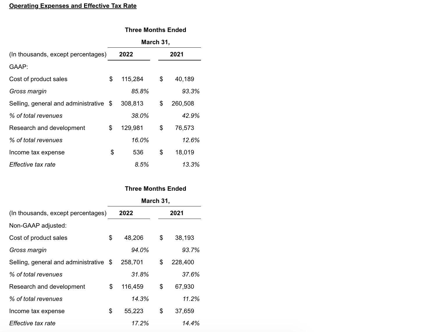 - Cost of product sales increased in 1Q22 compared to the same period in 2021, on a GAAP and on a non-GAAP adjusted basis, due to increased net product sales as a result of the acquisition of GW. In addition, acquisition accounting inventory fair value step-up expense of $63.9 million in 1Q22 impacted GAAP cost of product sales.
