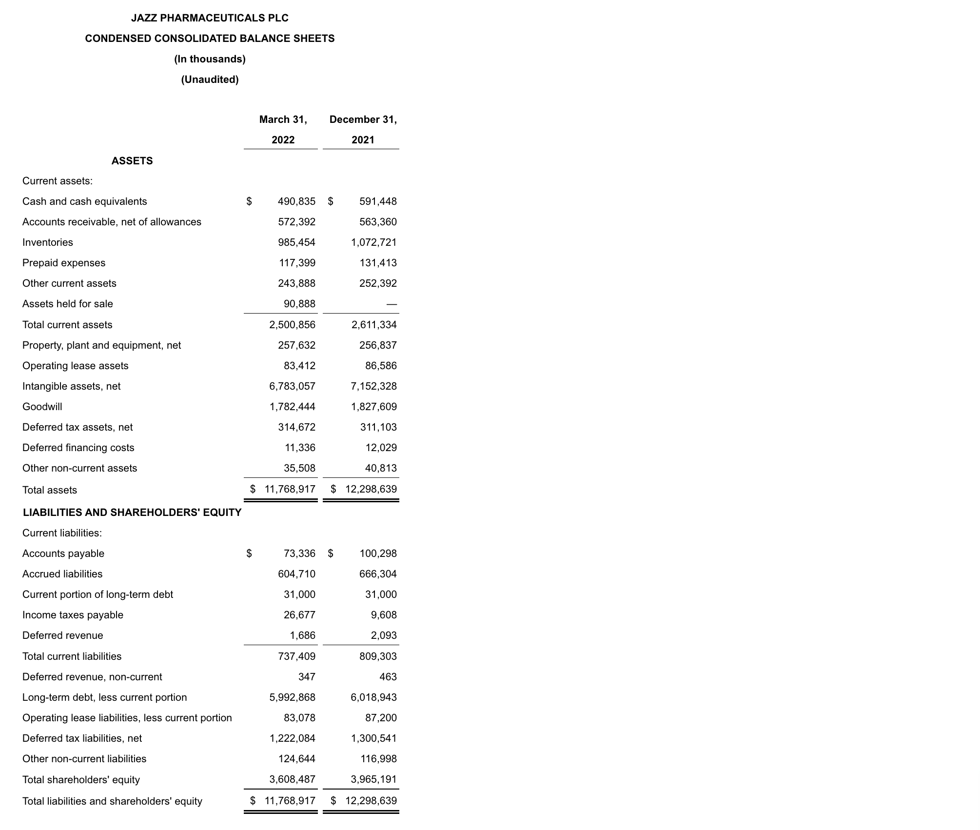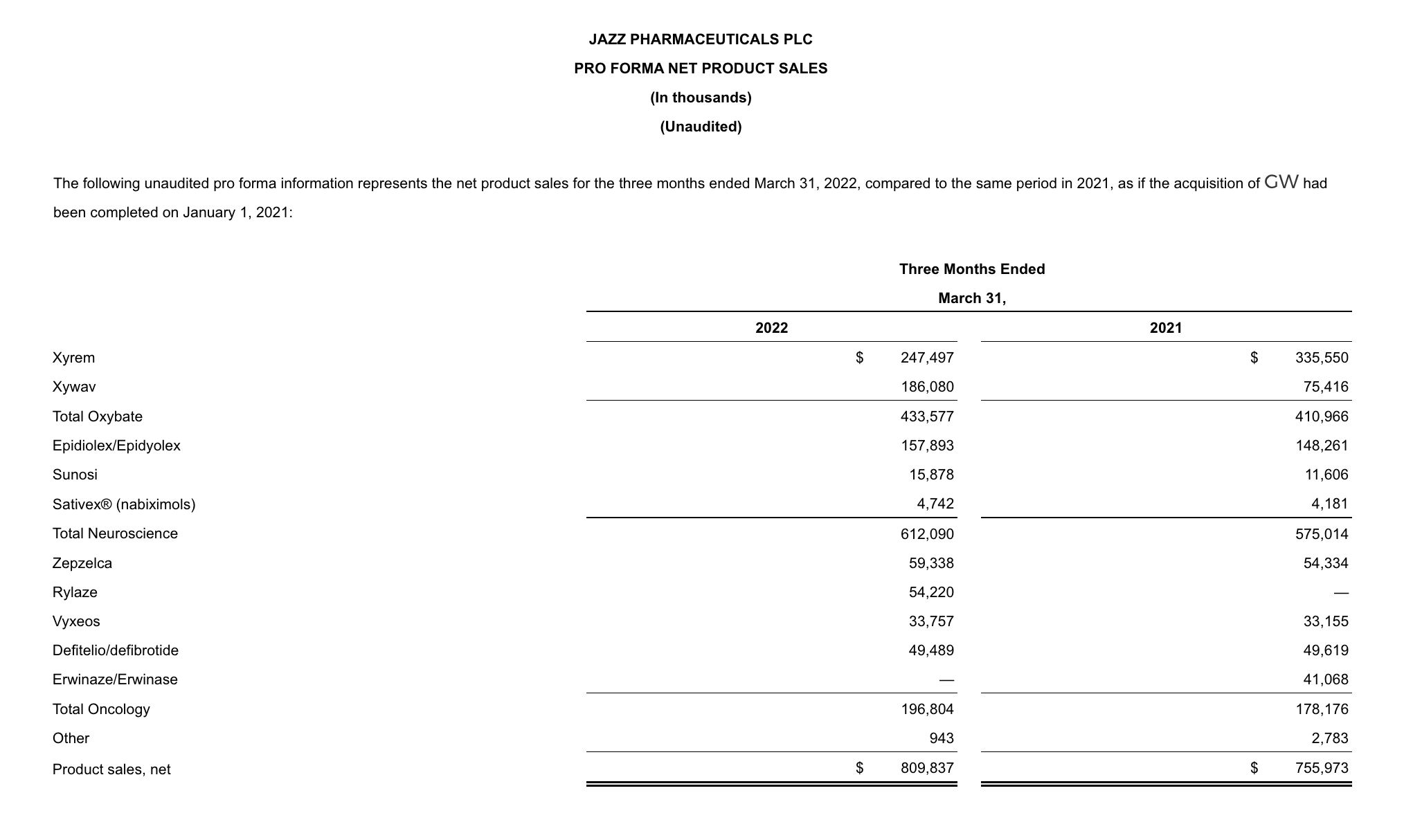 - On March 28, 2022, Jazz entered into a definitive agreement to divest Sunosi to Axsome Therapeutics.
