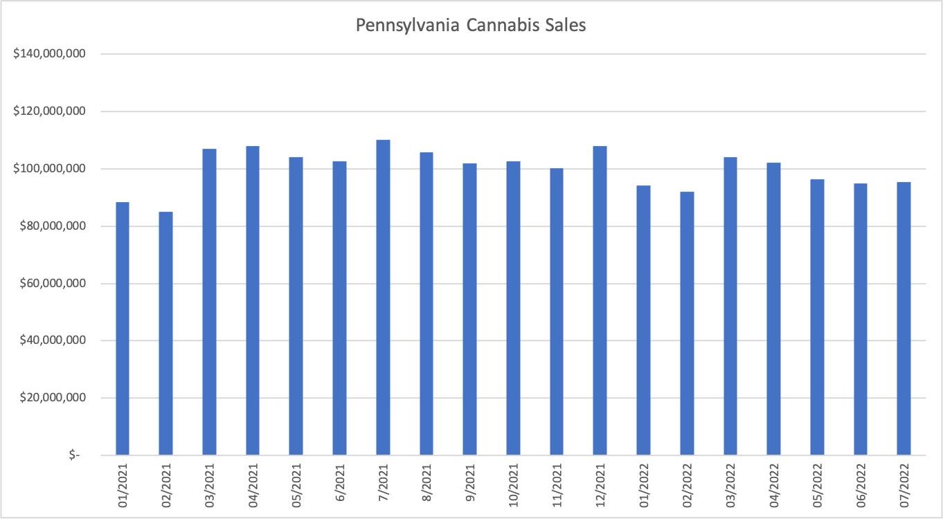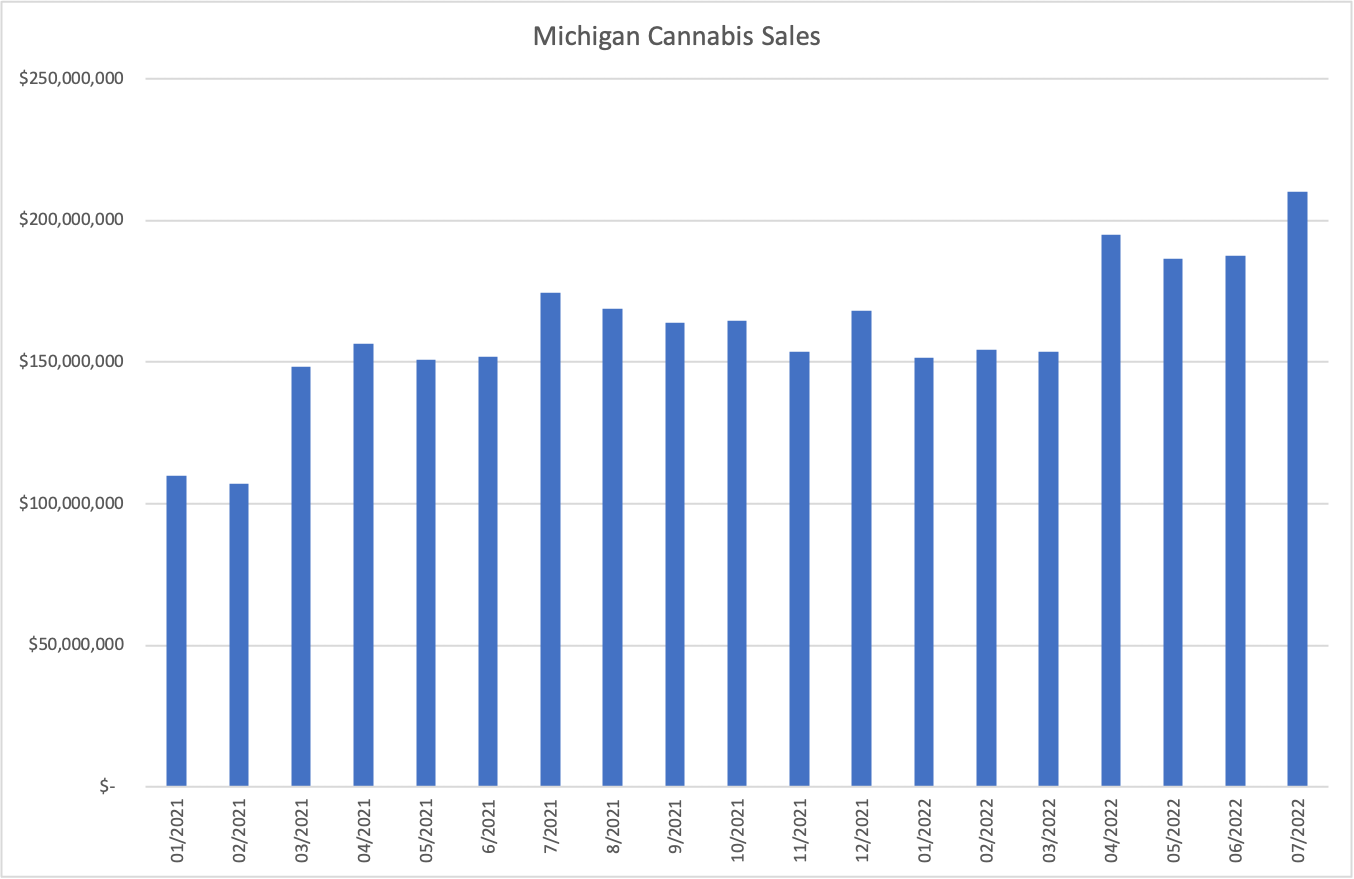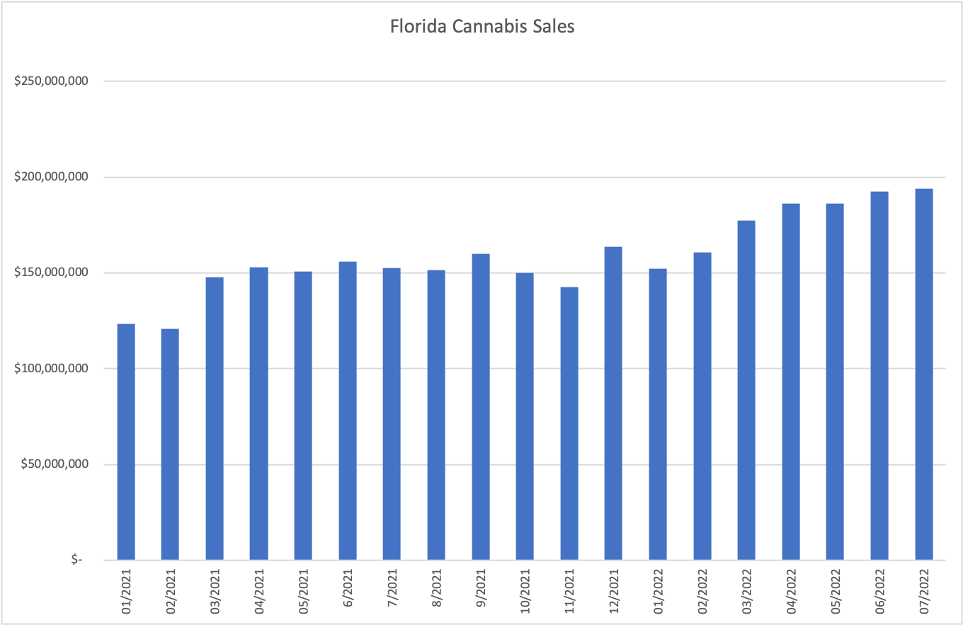 We previously published data released by the state showing that sales grew 6% from June and increased 1.6% from July 2021. BDSA estimated sales of $164.6 million, up 6% sequentially and up 0.6% from a year ago. Compared to last year, flower sales declined 3%, pre-rolls jumped 31%, ingestibles fell 5% and concentrates increased 2%.