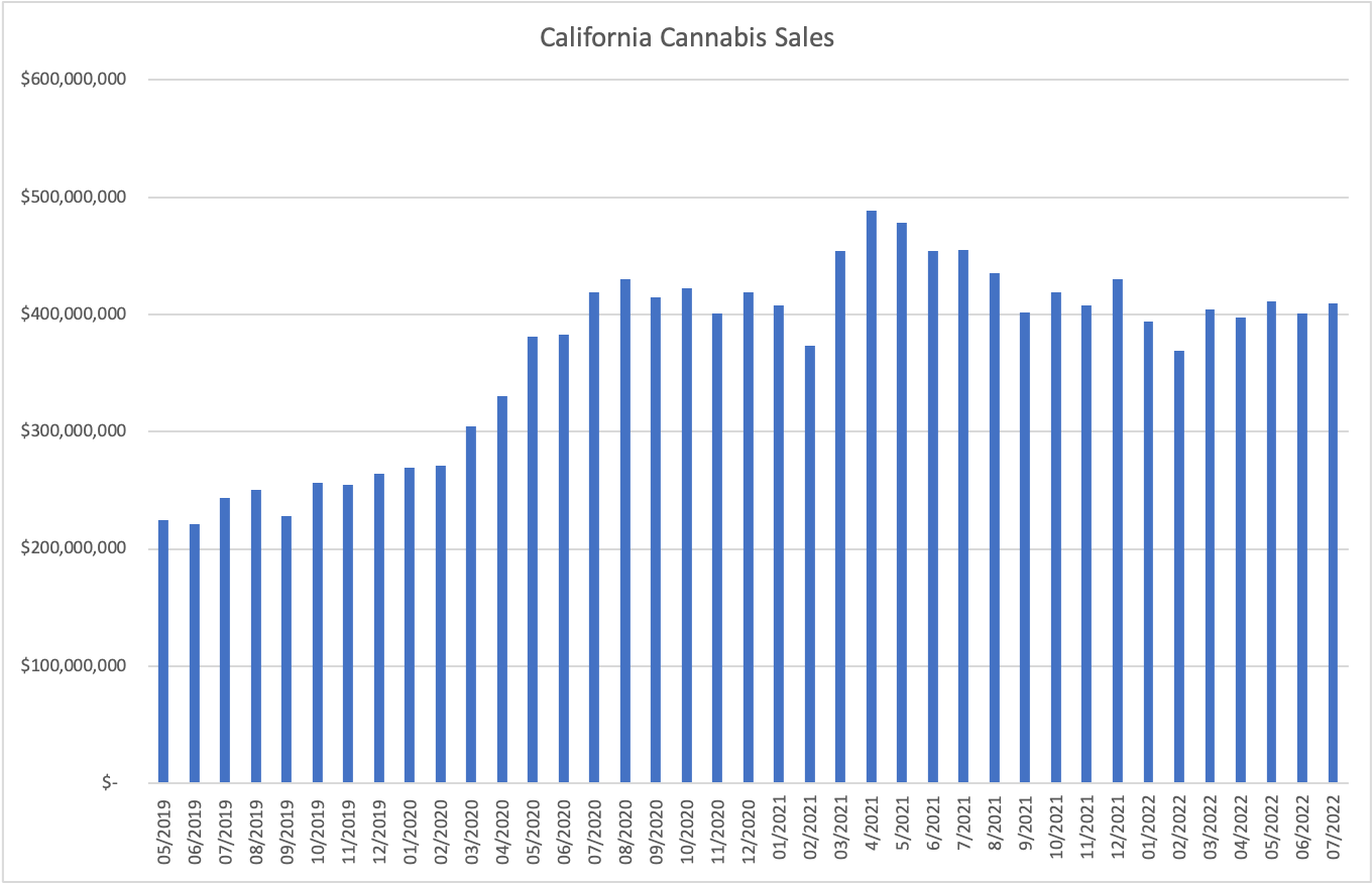 California sales increased 2.2% sequentially to $409.6 million and fell 10.1% compared to a year ago. Flower sales were down 19%, while pre-rolls grew 6%. Ingestibles and concentrates fell 6% from a year ago during July.