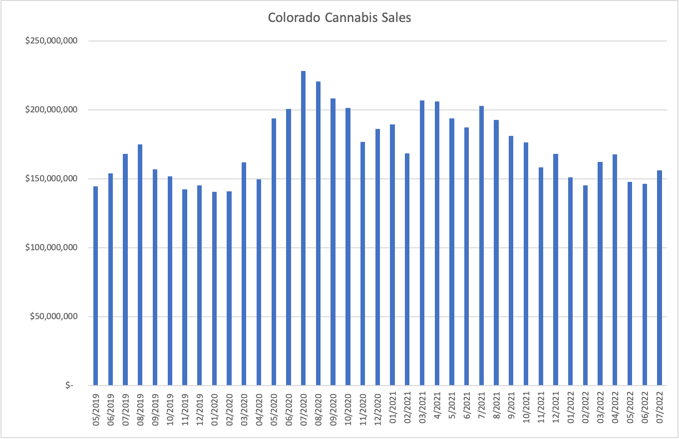 Sales increased 6.7% in July compared to June, dropping 23.1% from a year ago to $156.2 million. Flower sales were down 25%, pre-rolls declined 21%, while concentrates fell 20%. Ingestibles declined 24% year-over-year.
