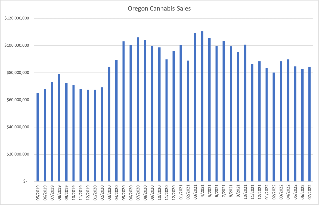 Sales in July grew 2% from June to $84.4 million, down 18.4% from a year ago. Flower sales were down 31% year-over-year. Ingestibles grew 8%, while pre-rolls declined 3% and concentrates decreased 17%.