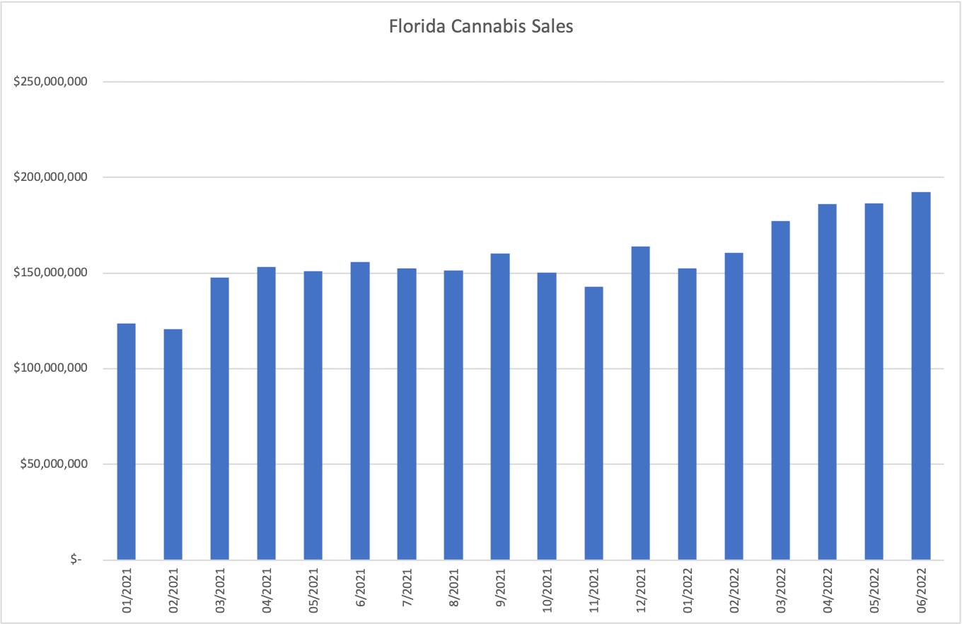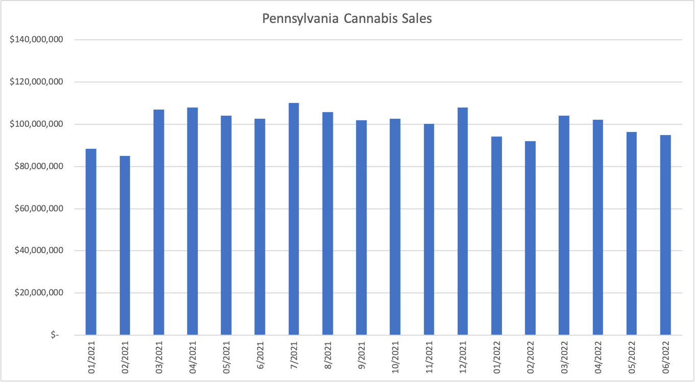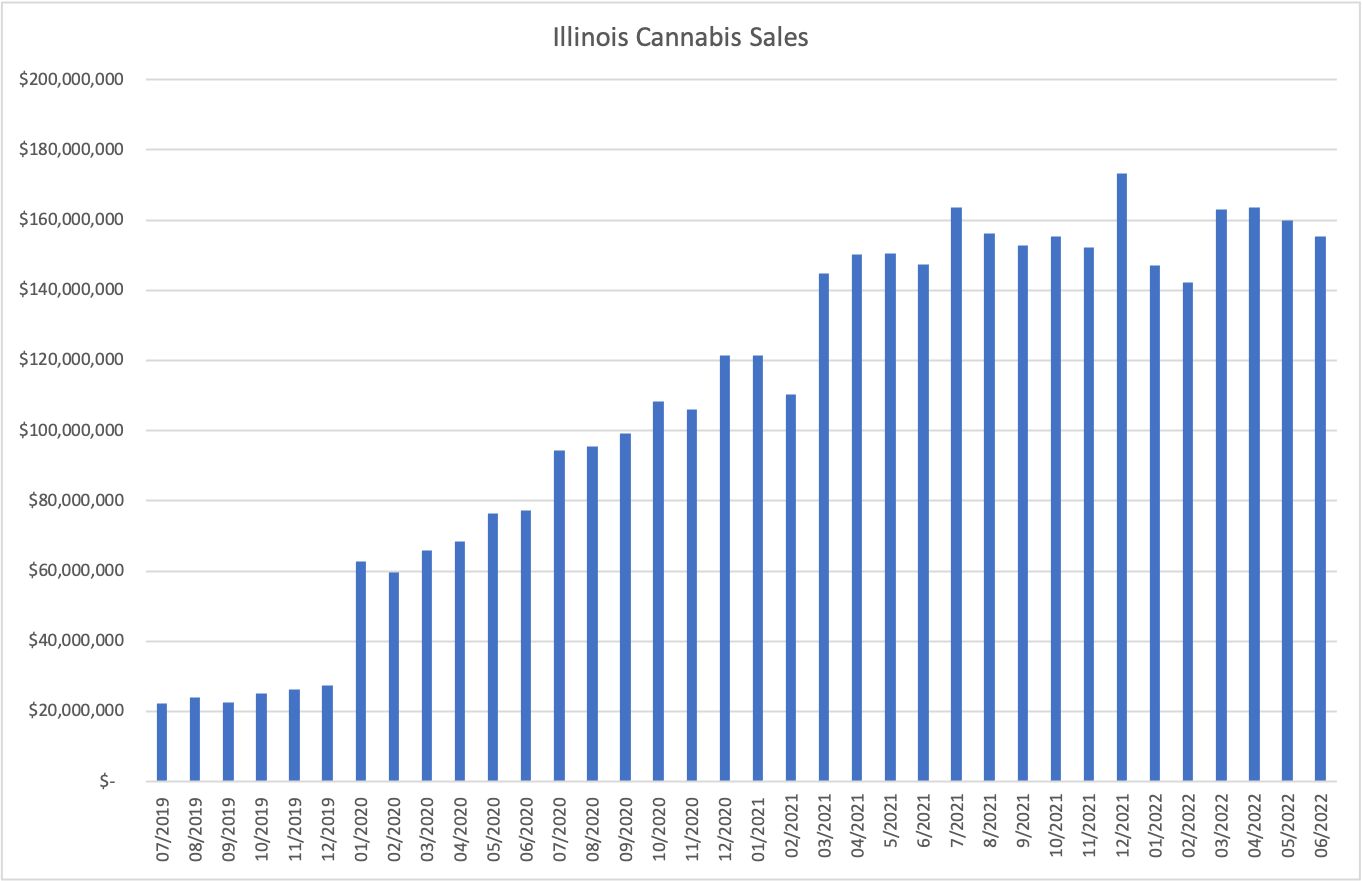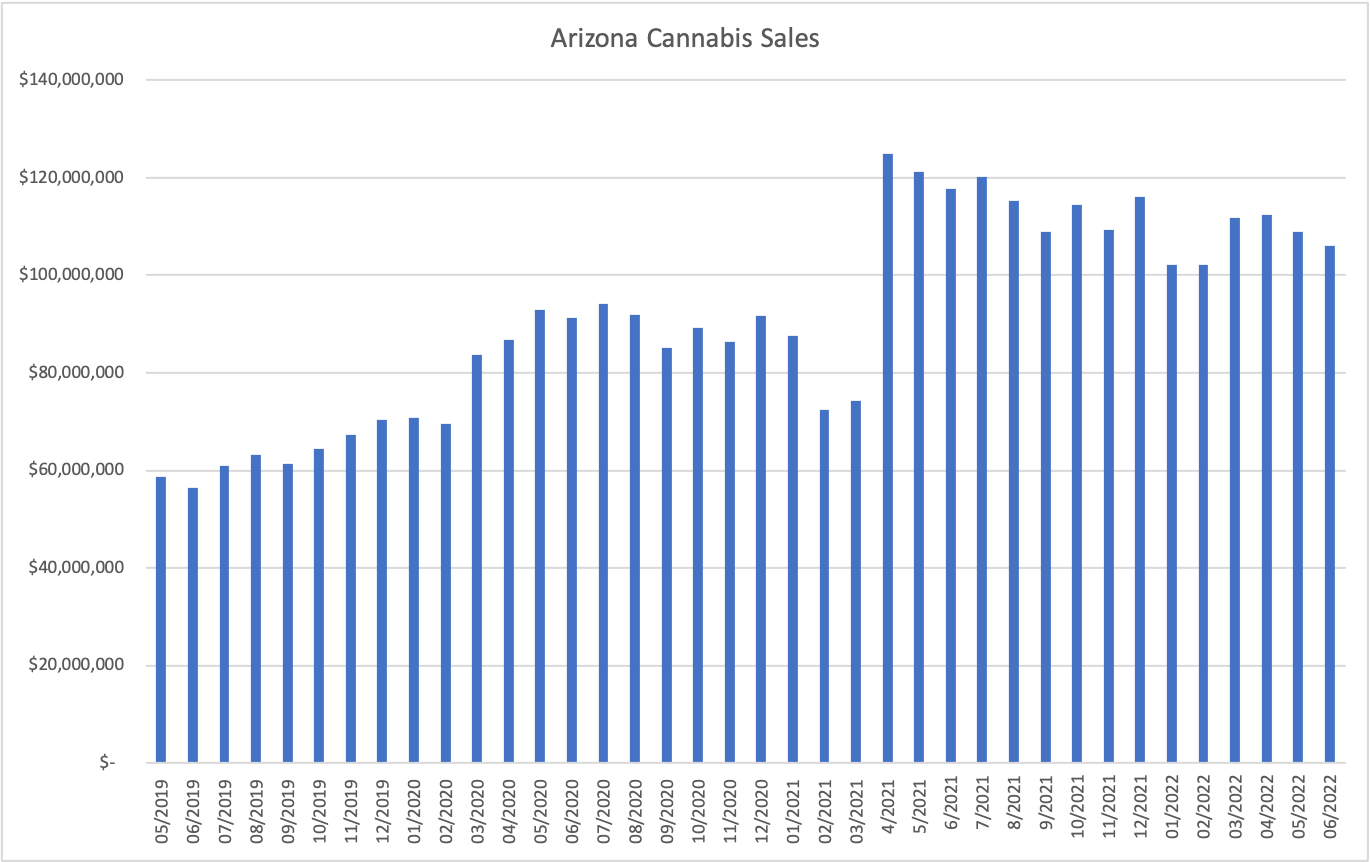 We previously published data released by the state showing that sales declined 3% from May and increased 5.4% from June 2021. BDSA estimated sales of $155.3 million, down 2.9% sequentially and up 5.4% from a year ago. Compared to last year, flower sales remained flat, pre-rolls jumped 36%, ingestibles grew 2% and concentrates increased 8%.