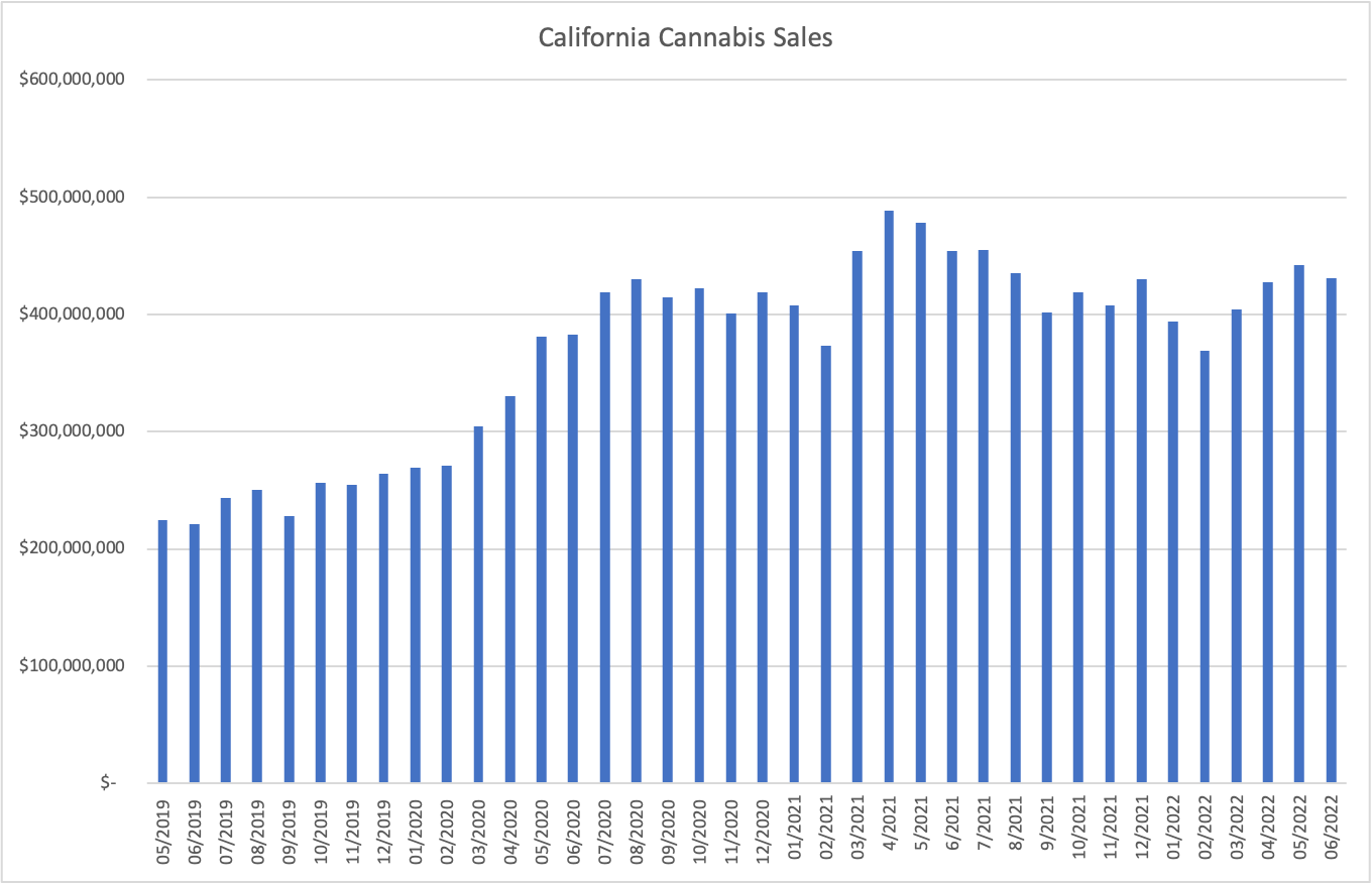 California sales declined 2.5% sequentially to $431.3 million and fell 5.1% compared to a year ago. Flower sales were down 15%, while pre-rolls grew 12%. Ingestibles fell 4% and concentrates remained flat from a year ago during June.