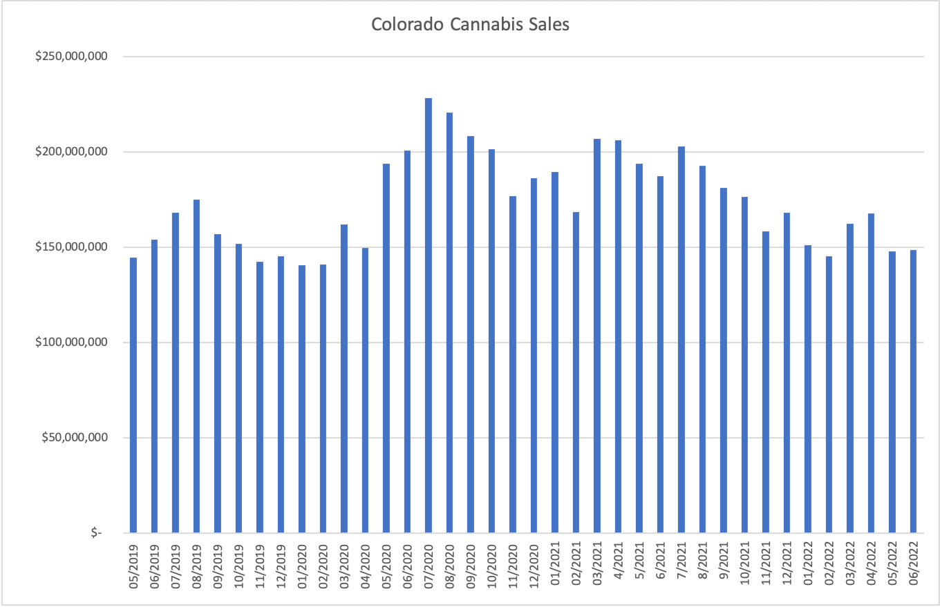 Sales increased 0.6% in June compared to May, dropping 20.6% from a year ago to $148.8 million. Flower sales were down 24%, with pre-rolls and concentrates falling 16%. Ingestibles declined 22% year-over-year.