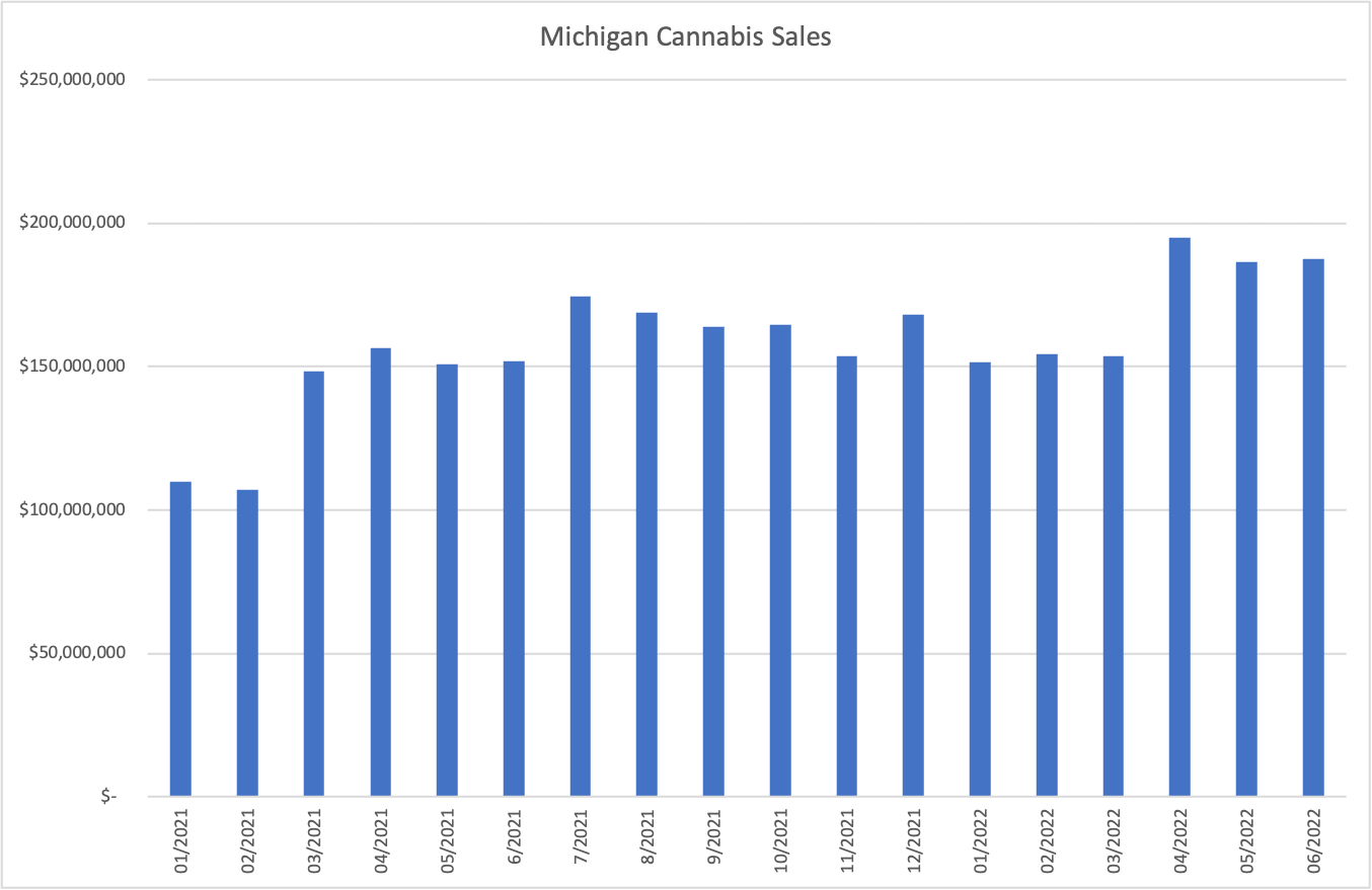We had previously written about data released by the state indicating that Michigan cannabis sales gained 0.5% sequentially and 26% year-over-year. BDSA estimated sales of $187.4 million, up 0.5% sequentially and 23.5% from a year ago. Flower sales increased 16%, while concentrates grew 49%. Pre-rolls jumped 64% and ingestibles remained flat compared to prior year.