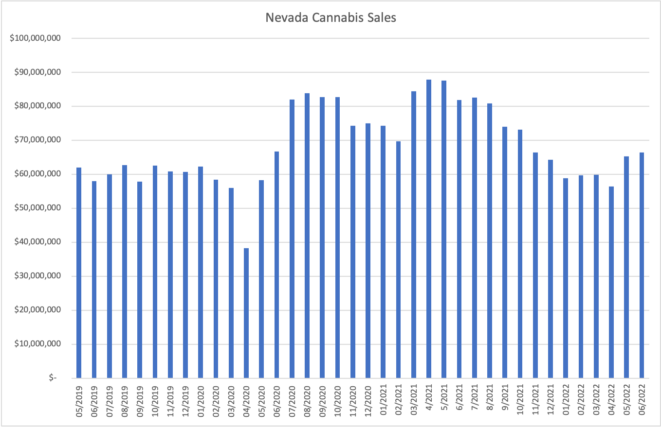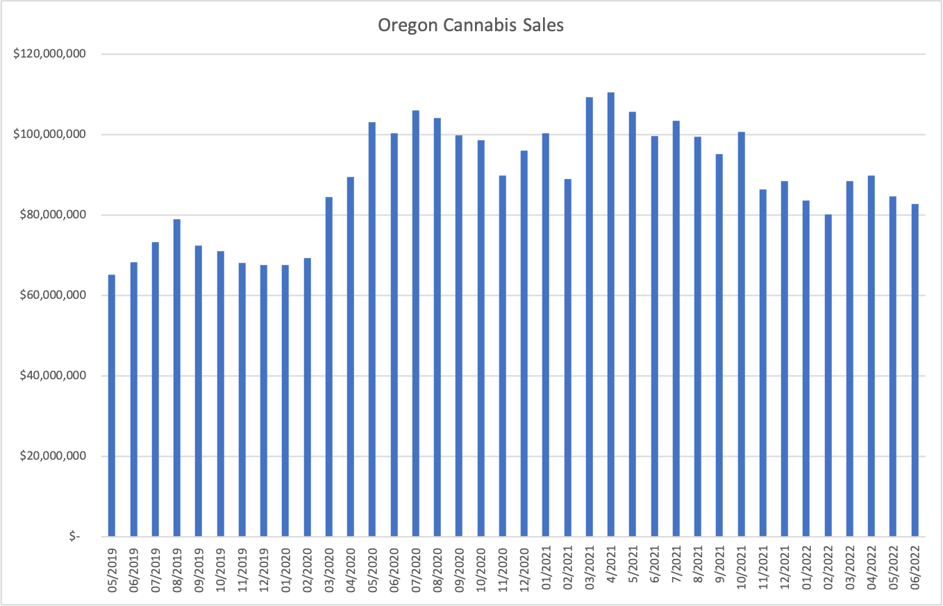 Sales in June fell 2.3% from May to $82.7 million, down 17% from a year ago. Flower sales were down 30% year-over-year. Ingestibles grew 11%, while pre-rolls declined 5% and concentrates decreased 14%.