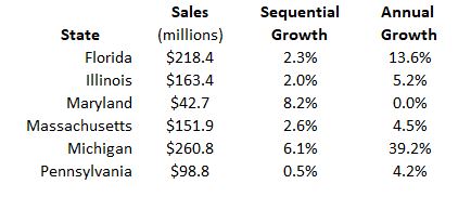 BDSA provides coverage for Florida, Illinois, Maryland, Massachusetts, Michigan and Pennsylvania. In June, year-over-year growth ranged from 0% in Maryland to +39.2% in Michigan. Note that Florida, Maryland and Pennsylvania are medical-only markets, though Maryland has introduced adult-use in July. Sequential growth was positive in all markets despite there being one less day in June. Annual growth was not down in any market, while Maryland and Illinois fell in May from a year ago.