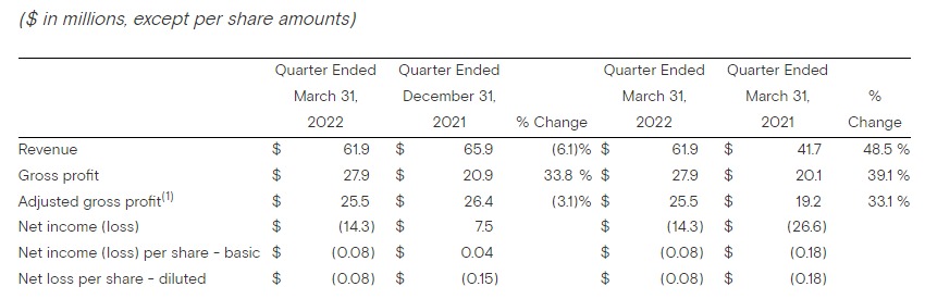 The following is a tabular summary and commentary of revenue, gross profit, adjusted gross profit, net income (loss), and net income (loss) per share for the three-month periods ended March 31, 2022, December 31, 2021, and March 31, 2021.