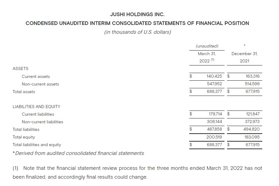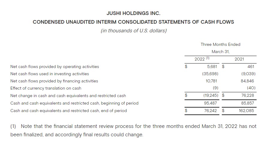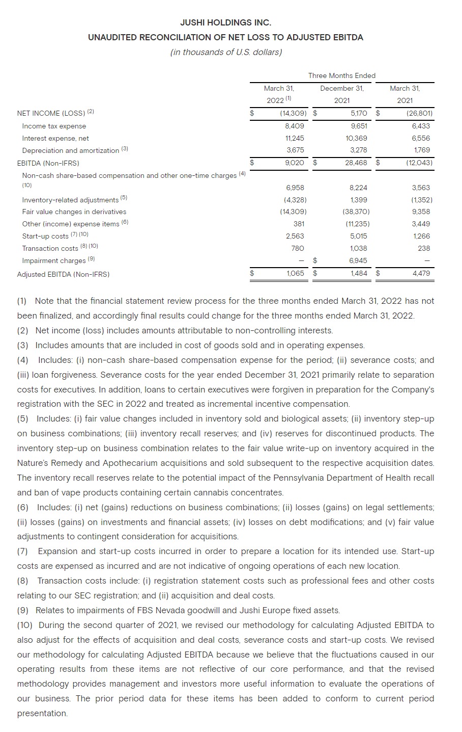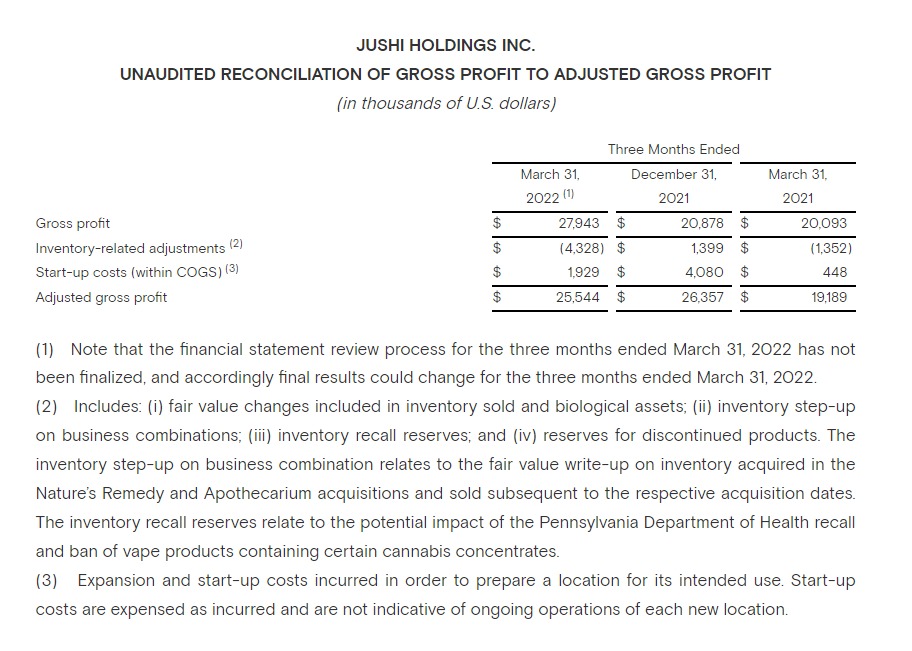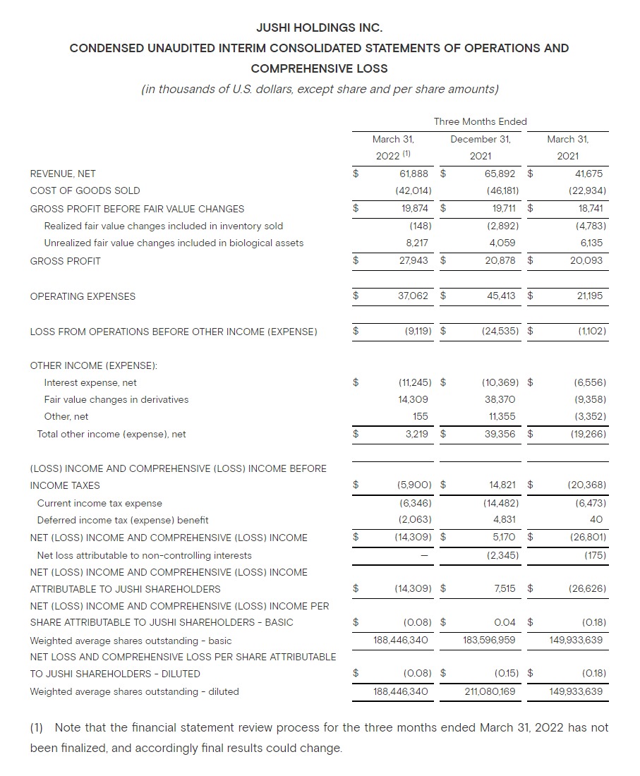 BOCA RATON, Fla., May 25, 2022 (GLOBE NEWSWIRE) — Jushi Holdings Inc. (“Jushi” or the “Company”) (CSE: JUSH) (OTCQX: JUSHF), a vertically integrated, multi-state cannabis operator, is pleased to announce its financial results for the first quarter 2022 (“Q1 2022”) ended March 31, 2022. All financial information is provided in U.S. dollars unless otherwise indicated.