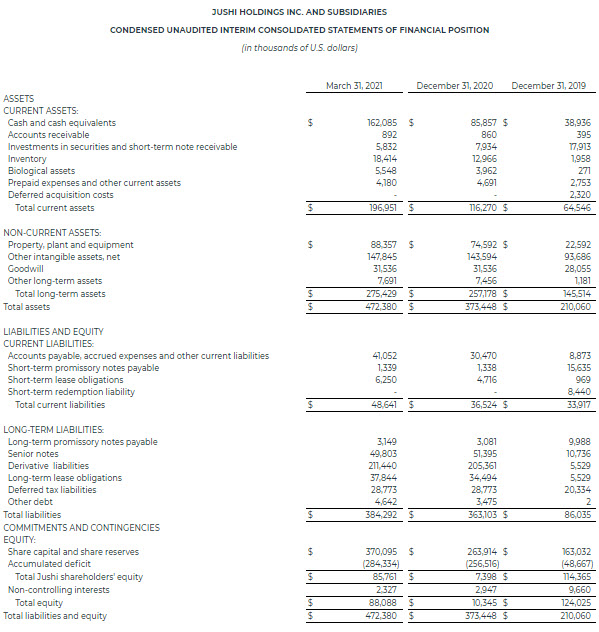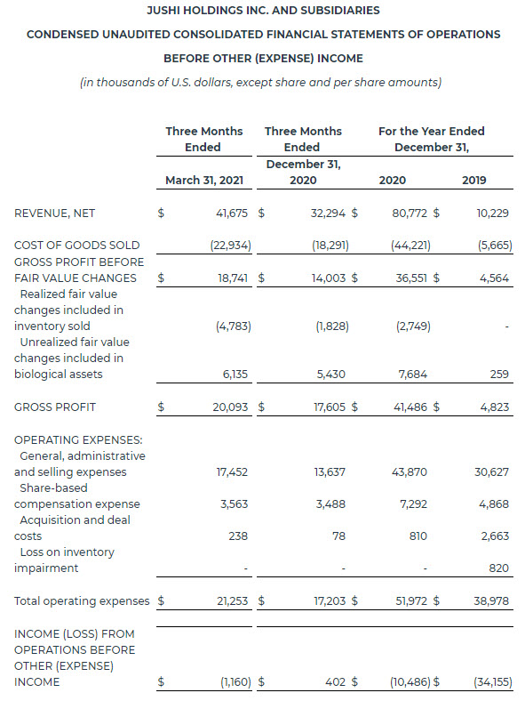 BOCA RATON, Fla., May 28, 2021 (GLOBE NEWSWIRE) — Jushi Holdings Inc. (“Jushi” or the “Company”) (CSE: JUSH) (OTCMKTS: JUSHF), a vertically integrated, multi-state cannabis operator, announced its first quarter 2021 ended March 31, 2021 financial results. All financial information is provided in U.S. dollars unless otherwise indicated. The Company is also providing an update with respect to the filing of the Company’s audited annual financial statements for the year ended December 31, 2020, the related management’s discussion and analysis, related CEO and CFO certificates and annual information form for the year ended December 31, 2020 (collectively, the “Documents”).