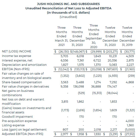 EBITDA and Adjusted EBITDA are financial measures that are not defined under IFRS. Management believes EBITDA is a useful measure to assess the performance of the Company as it provides meaningful operating results by excluding the effects of expenses that are not reflective of our operating business performance. Management defines EBITDA as net income (loss), or “earnings”, before interest, income taxes, depreciation and amortization. We believe Adjusted EBITDA is a useful measure to assess the performance of the Company as it provides more meaningful operating results by excluding the effects of expenses that are not reflective of the Company’s operating business performance and other one-time or non-recurring expenses. We define Adjusted EBITDA as EBITDA before: (i) fair value changes included in inventory sold and fair value changes included in biological assets; (ii) share-based compensation expense; (iii) fair value changes in derivatives; (iv) net gains on business combinations; (v) gains and losses on investments and financial assets; (vi) net loss on debt and warrant modification; (vii) gains and losses on legal settlements; (viii) pre-acquisition expense; (ix) listing expense; and (x) goodwill impairment. The financial measures noted above are metrics that have been adjusted from the IFRS net income (loss) measure in an effort to provide readers with a normalized metric in making comparisons more meaningful across the cannabis industry, as well as to remove non-recurring, irregular and one-time items that may otherwise distort the IFRS net income measure. Other companies in the Jushi’s industry may calculate this measure differently, limiting their usefulness as comparative measures.