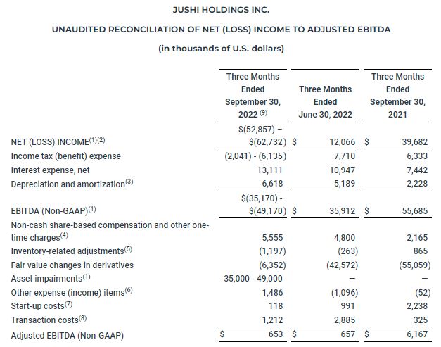 Adjusted EBITDA2 in Q3 2022 was $0.7 million, which was flat as compared to $0.7 million in Q2 2022, and a decrease of $5.5 million compared to $6.2 million in Q3 2021. Adjusted EBITDA benefited from increased sales of Jushi branded products, offset by infrastructure and headcount investments at the Company’s grower processors that continue to have a transitional impact as the business scales, and slower-than-expected growth of wholesale operations.