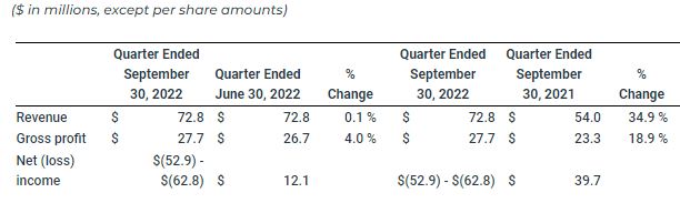 The following is a tabular summary and commentary of revenue, gross profit, net income (loss), and net income (loss) per share for the three-month periods ended September 30, 2022, June 30, 2022, and September 30, 2021.
