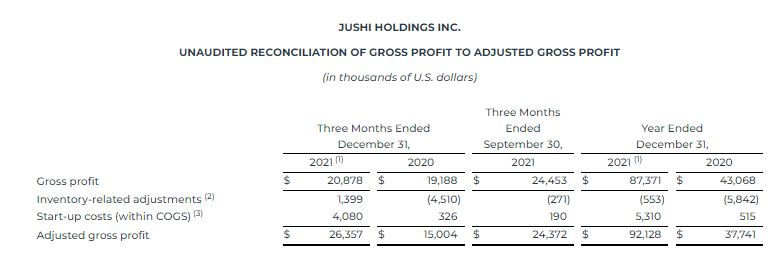 FY 2021 adjusted gross profit(1) was $92.1 million, or 44.0% of revenue, compared to $37.7 million or 46.7% of revenue in 2020. The increase in adjusted gross profit(1) was driven by the Company’s expanded retail business, including the addition of 13 new stores, and increased distribution of Jushi’s branded products into the wholesale market.