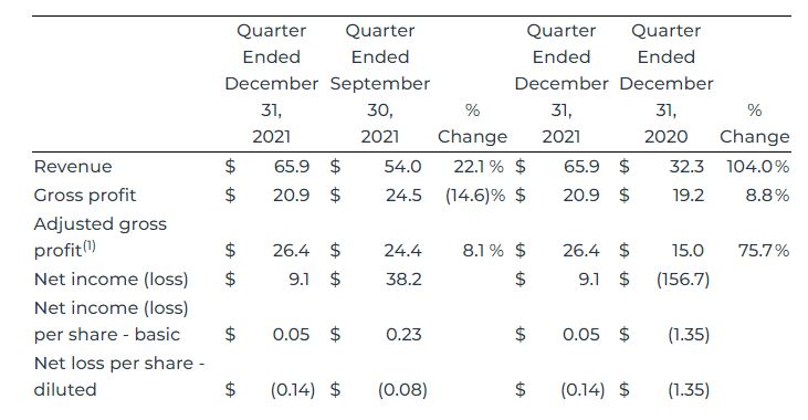 The following is a tabular summary and commentary of revenue, gross profit, adjusted gross profit(1), net income (loss), and net income (loss) per share for the three-month periods ended December 31, 2021, September 30, 2021, and December 31, 2020.