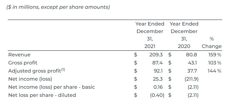 The following is a tabular summary and commentary of revenue, gross profit, adjusted gross profit(1), net income (loss), and net income (loss) per share for the twelve-month periods ended December 31, 2021, and December 31, 2020.