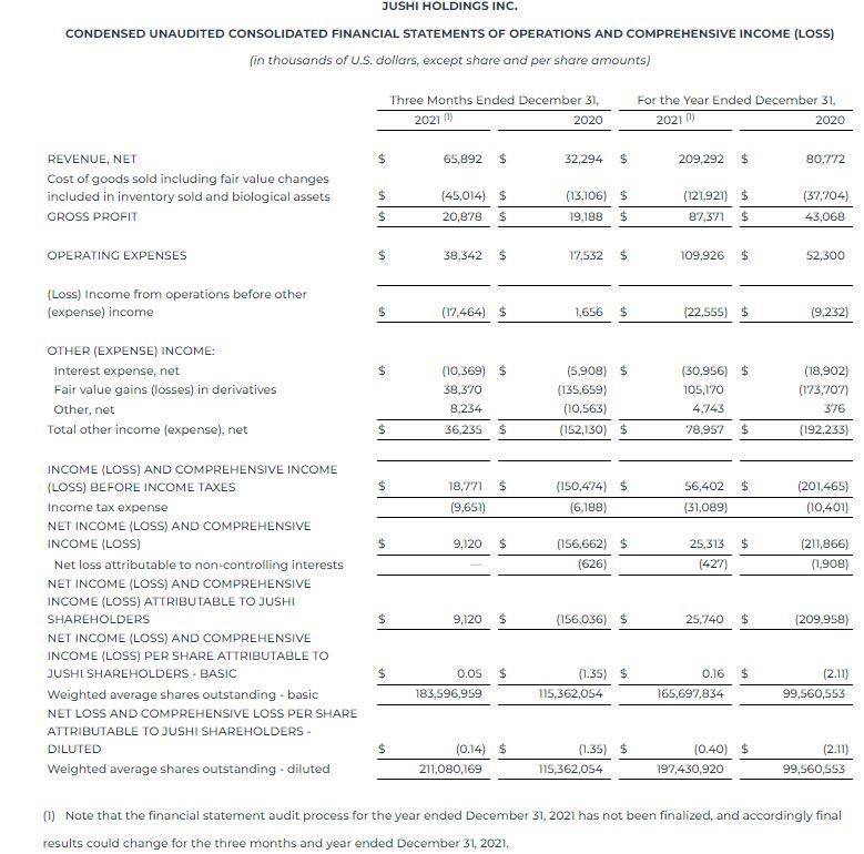 Jim Cacioppo concluded, “Now with 29 stores open and operating, licenses to open another 11 stores(3), approximately 248 thousand square feet of operational cultivation and processing capacity, and an additional 82 thousand square feet anticipated to come online this year, we expect to cement our retail network and rapidly expand our wholesale business in some of the most exciting markets in the U.S. We are incredibly proud our people and the platform we have built, and we are ready to build on this momentum into 2022 and beyond as we position Jushi for the future.”