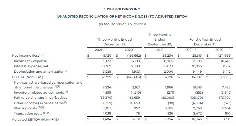 EBITDA and Adjusted EBITDA are financial measures that are not defined under IFRS. Management defines EBITDA as net income (loss), or “earnings”, before interest, income taxes, depreciation and amortization. Management defines Adjusted EBITDA as EBITDA before: (i) non-cash share-based compensation expense and other one-time charges; (ii) inventory-related adjustments; (iii) fair value changes in derivatives; (iv) other income/expense items (xiii) transaction costs; and (v) start-up costs. The financial measures noted above are metrics that have been adjusted from the IFRS net income (loss) measure in an effort to provide readers with a normalized metric in making comparisons more meaningful across the cannabis industry, as well as to remove non-recurring, irregular and one-time items that may otherwise distort the IFRS net income measure. Other companies in the Corporation’s industry may calculate this measure differently, limiting their usefulness as comparative measures. “Adjusted Gross Profit” represents gross profit, as reported, adjusted to exclude certain inventory-related adjustments and start-up costs (within COGS).