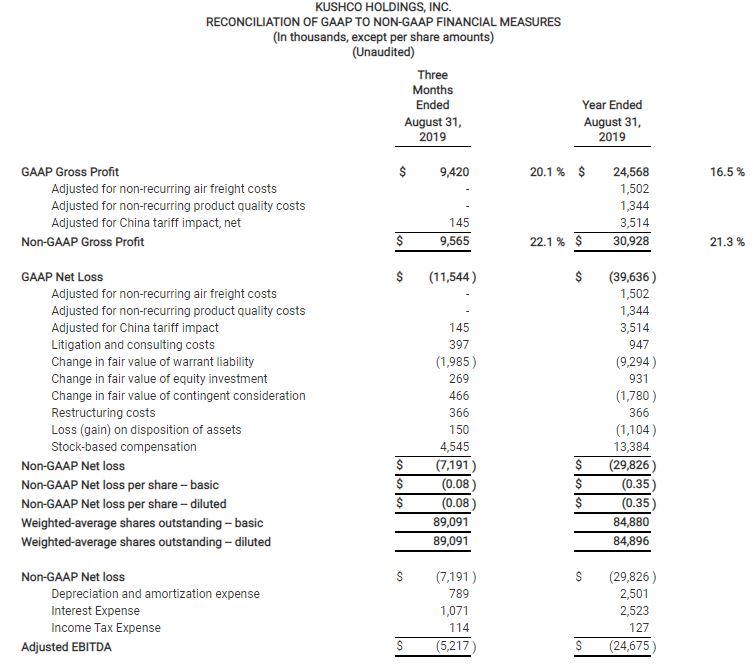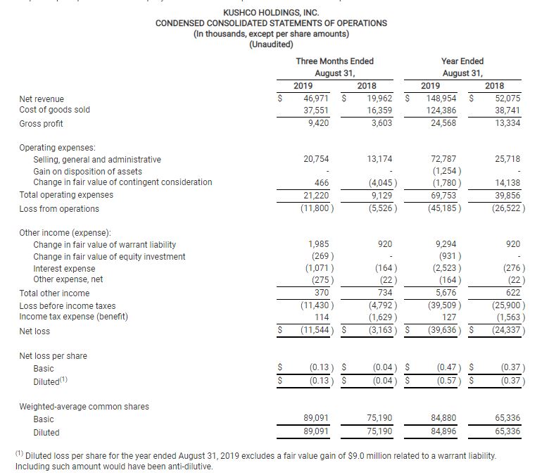CYPRESS, CA / ACCESSWIRE / November 7, 2019 / KushCo Holdings, Inc. (OTCQX:KSHB) (“KushCo” or the “Company”), the premier producer of ancillary products and services to the legal cannabis and CBD industries, today reported financial results for its fiscal fourth quarter and full year ended August 31, 2019.