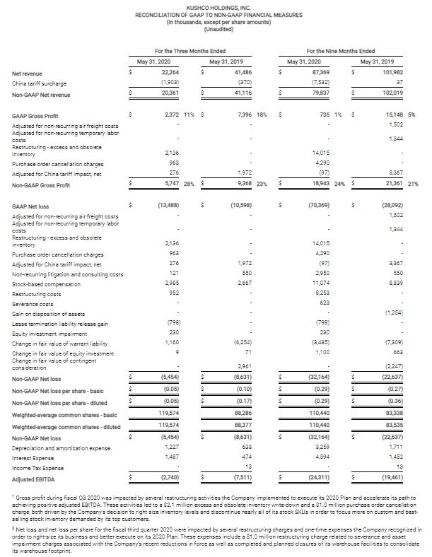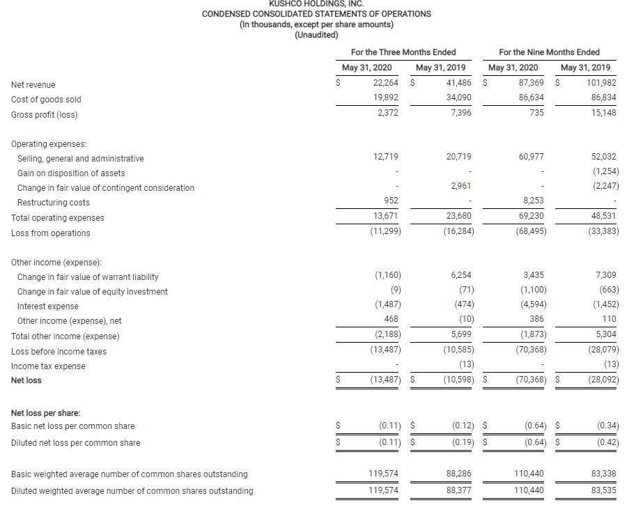 CYPRESS, CA / ACCESSWIRE / July 8, 2020 / KushCo Holdings, Inc. (OTCQX:KSHB) (“KushCo” or the “Company”), the premier provider of ancillary products and services to the legal cannabis and CBD industries, today reported financial results for its fiscal third quarter ended May 31, 2020.