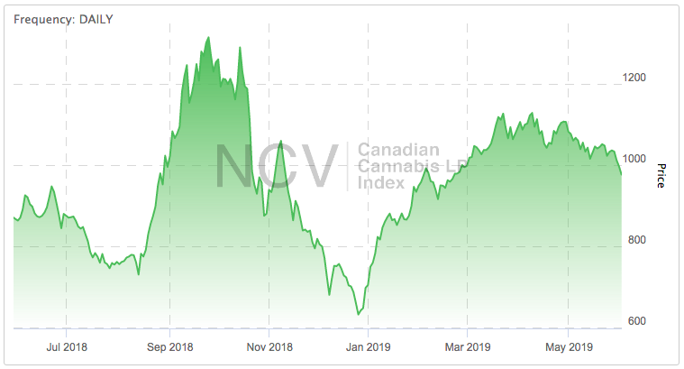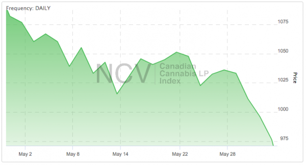 After a 54.9% gain in Q1, the Canadian Cannabis LP Index backtracked marginally in April and then fell sharply in May, declining 9.7% to 976.56: