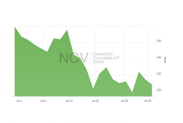 After breaking a three-month losing streak with a 1% gain in June, the Canadian Cannabis LP Index fell sharply in July, declining 9.8% to 324.18: