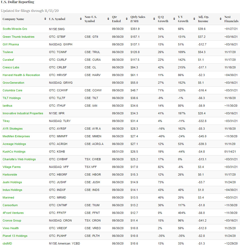 In the first part of November, several of the largest companies by revenue reported, including Scotts Miracle-Gro (NYSE: SMG), Green Thumb Industries (CSE: GTII) (OTC: GTBIF) and GW Pharma (NASDAQ: GWPH). The Hawthorne division of Scotts ended the year with revenue of $1.08 billion, up 61%, and the company is guiding for fiscal 2021 revenue to grow 15-20%. GTI had been expected to generate revenue of $134 million, up 97% from a year ago, and the actual revenue, all organic, was 131% above year-ago levels. The company’s adjusted EBITDA expanded by more than 50% compared to Q2, reaching over $53 million. GW Pharma also soundly beat expectations, as analysts had forecast revenue of $127 million.