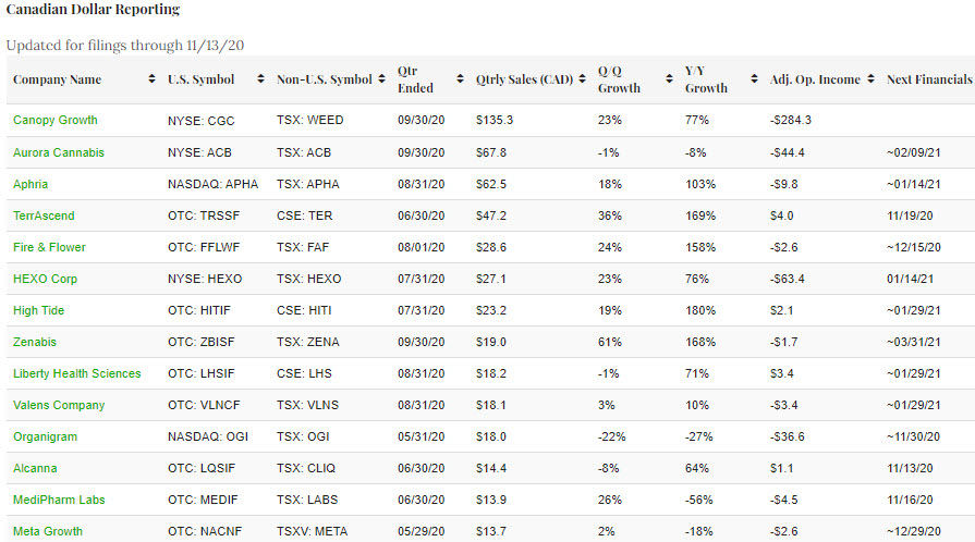 Canadian Dollar Reporting – Public Cannabis Company Revenue Tracker