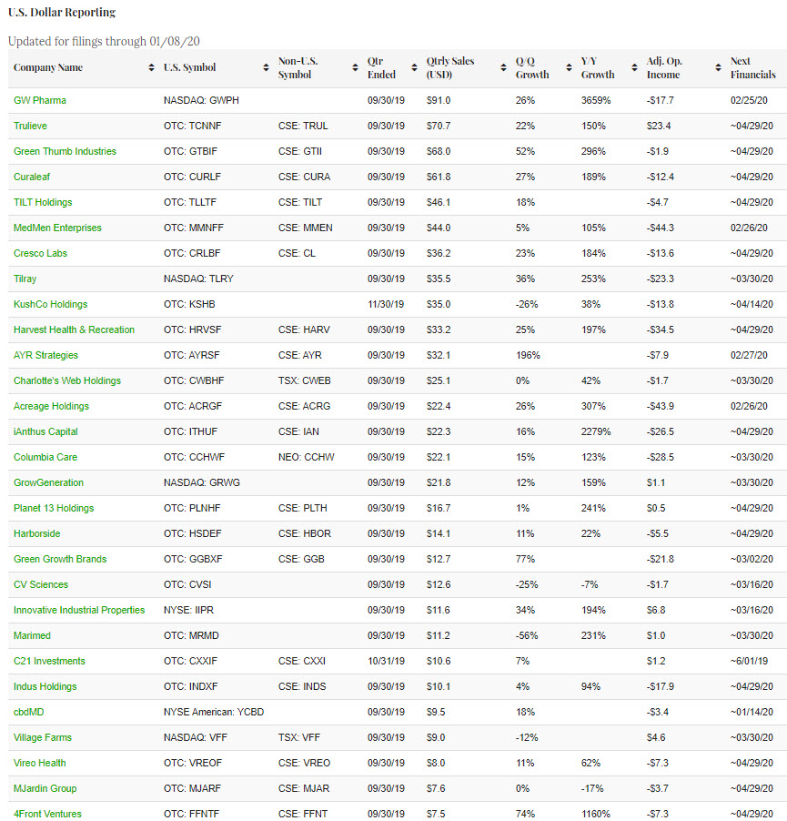 The Public Cannabis Company Revenue & Income Tracker, managed by New Cannabis Ventures, ranks the top revenue producing cannabis stocks that generate industry sales of more than US$7.5 million per quarter (C$9.9 million). This data-driven, fact-based tracker will continually update based on new financial filings so that readers can stay up to date. Companies must file with the SEC or SEDAR to be considered for inclusion. Please note that we raised the minimum quarterly revenue in May from US$2.5 million and from US$5.0 million in October.