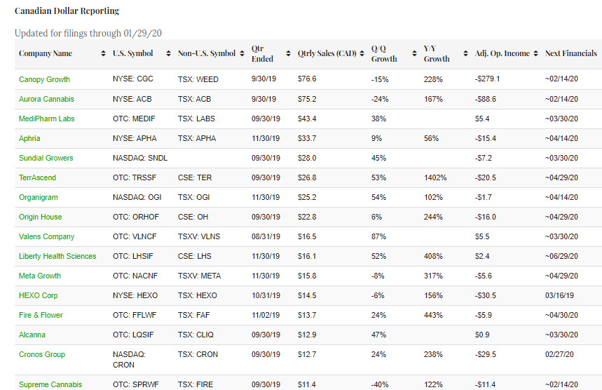 Canadian Dollar Reporting – Public Cannabis Company Revenue Tracker