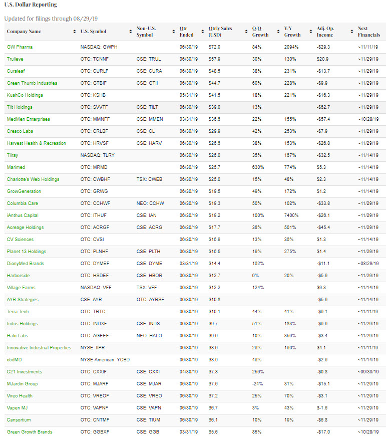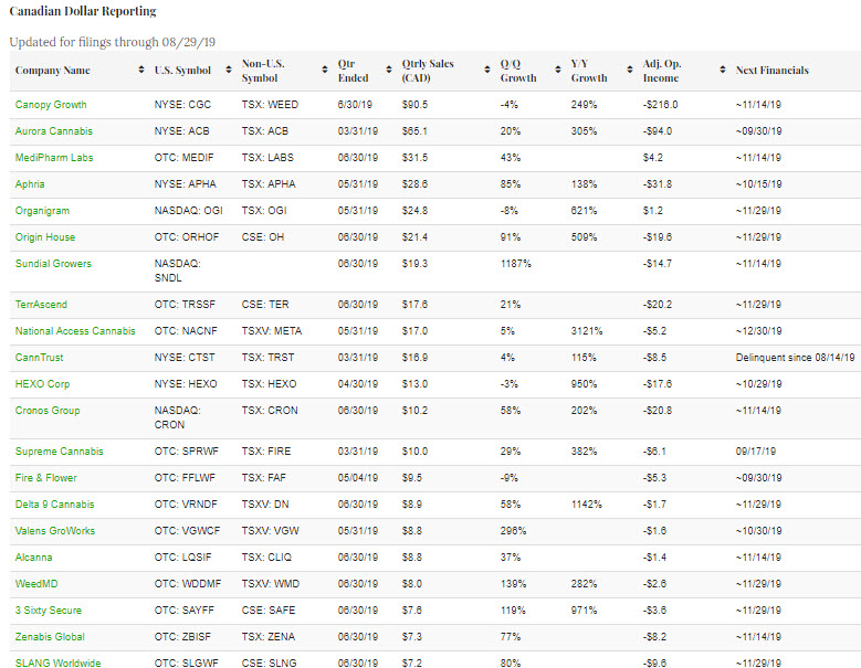 54 companies currently qualify for inclusion, with 33 filing in U.S dollars and 21 in the Canadian currency, which is up from 49 just two weeks ago. Since our last report in mid-August, the new additions include U.S. dollar reporting companies Harborside (CSE: HBOR) (OTC: HSDEF), Indus Holdings (CSE: INDS) (OTC: INDXF) and Vapen MJ (CSE: VAPN) (OTC: VAPNF) and Canadian dollar reporters, including Canadian LPs Delta 9 Cannabis (TSXV: DN) (OTC: VRNDF) and WeedMD (TSXV: WMD) (OTC: WDDMF), ancillary services provider 3 Sixty Secure (CSE: SAFE) (OTC: SAYFF) and CPG company SLANG Worldwide (CSE: SLNG) (OTC: SLGWF). We also removed Canadian dollar reporters Isodiol International (CSE: ISOL) (OTC: ISOLF) and Sunniva (CSE: SNN) (OTC: SNNVF) after both reported quarters that were below the minimum qualifying level. We are not able to include Elixinol Global (ASX: EXL) (OTC: ELLXF) and Greenlane (NASDAQ: GNLN), which would otherwise qualify but don’t break out their cannabis-related revenue. We also note that Scotts Miracle-Gro (NYSE:SMG) derives substantial cannabis-related revenue through its Hawthorne Gardening operations, but we are unsure of the exact amount and, thus, aren’t including it at this time.