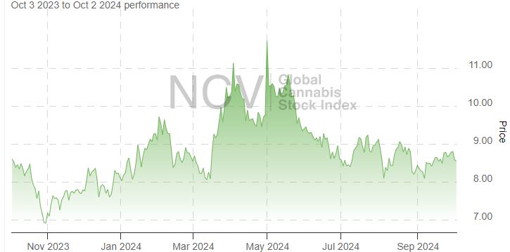 A year ago, I wrote that the cannabis sector was still in a bear market. Since then, the New Cannabis Ventures Global Cannabis Stock Index has increased slightly, rising 1.2% since 10/6. This is less than what cash earned, and it is a lot less than the rally in the S&P 500. Here is what the action has looked like over the past year: