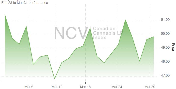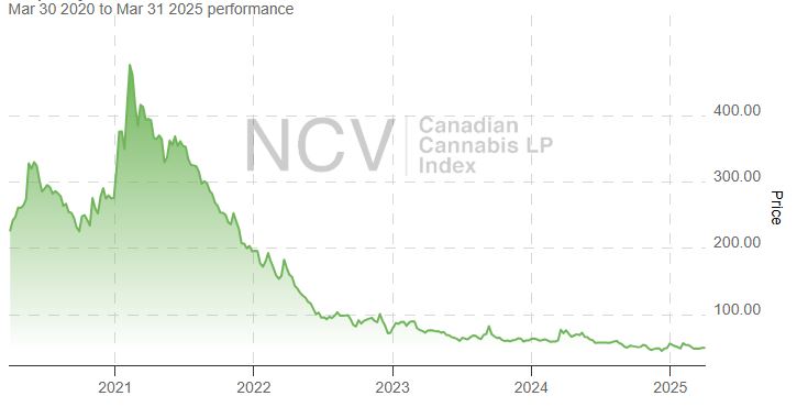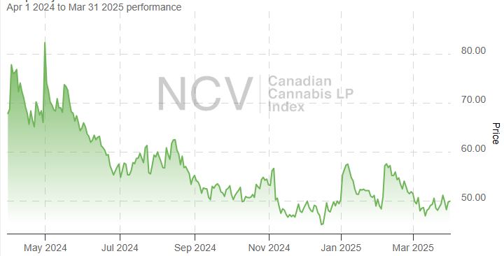 The Canadian Cannabis LP Index had a rough year in 2024, but it ended 2024 with a bounce and began 2025 by dropping just 2.5% during January and then rising 5.2% in February. In March, it declined 3.0% to 49.86:
