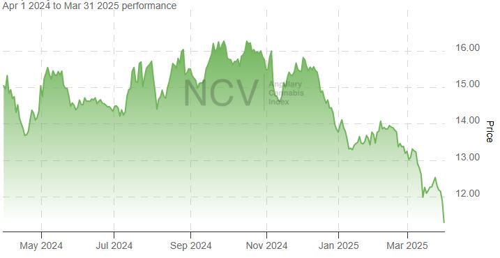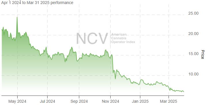 As we described in an article released earlier, the Global Cannabis Stock Index moved lower again in March as it fell 15.3%. It was down 15.2% in 2024, and it is down 26.9% so far this year.