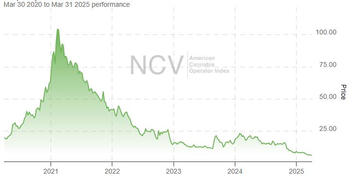 In 2024, this index was down 45.5% to 8.36 after it rallied 7.6% in 2023 despite the overall weakness in cannabis stocks, and it posted a new all-time low during March. It is down 28.4% so far in 2025: