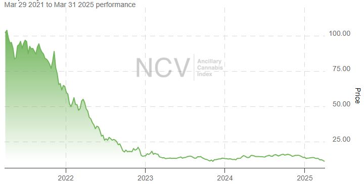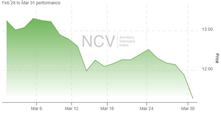 The Ancillary Cannabis Index was weak in December but had a good year last year. In January, it fell just 0.4%, but it fell more in February, hitting a new all-time low and declining 3.5%. In March, it plunged 14.7% to 11.30: