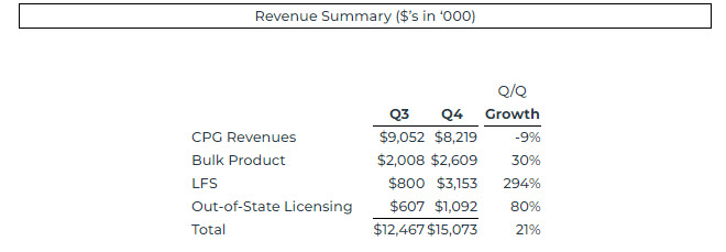 - Total revenues from out-of-state licensing reached $1.1 million in Q4, up 80% from the prior quarter.
