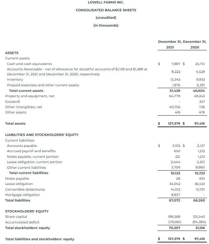 Lowell Farms Inc. Announces Unaudited Fourth Quarter and Fiscal Year 2021 Financial and Operational Results