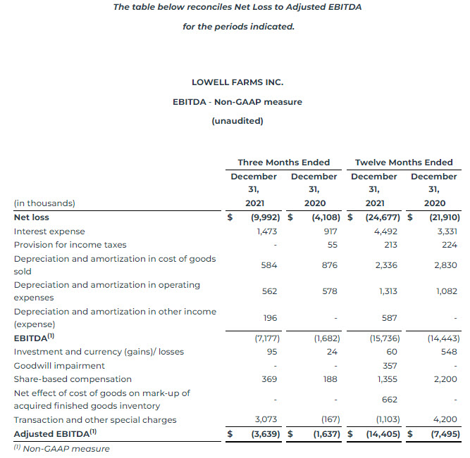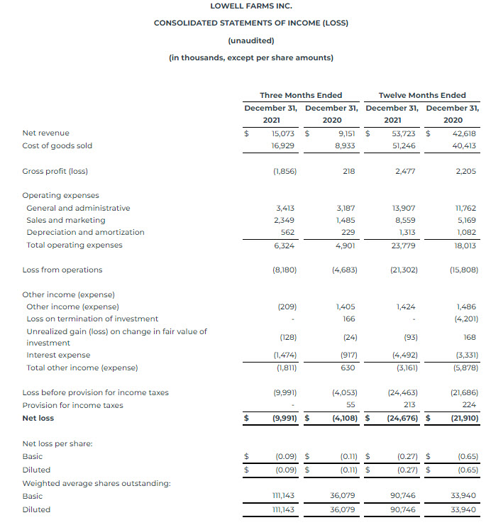 SALINAS, Calif., March 01, 2022 (GLOBE NEWSWIRE) — Lowell Farms Inc. (the “Company”) (CSE: LOWL; OTCQX: LOWLF), a California-born innovator in cannabis cultivation and maker of the legendary brand Lowell Smokes, announces unaudited revenue and operating results for the fourth quarter and fiscal year (ended December 31, 2021). All figures stated are in US Dollars.