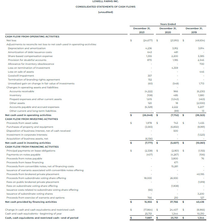 - Lowell Farms saw its flower production at the greenhouse continue to steadily increase year-over-year, with flower product totaling 8,336 lbs during the fourth quarter of 2021 in comparison to 5,913 lbs in the fourth quarter of 2020.