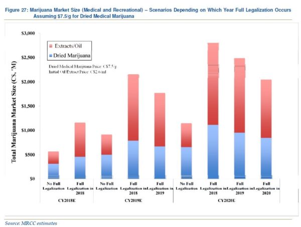 The analysts also contemplate full legalization. The report includes four pricing scenarios and accounts for the timing of potential legalization.  In the most bullish case, MRCC estimates that 2020 total cannabis sales in Canada could exceed $2.8 billion. The scenarios below assume dried cannabis sells for C$7.50 per gram: