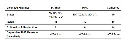 The combined company, excluding MPX International, will encompass operations and cannabis licenses in 10 states that will permit iAnthus to operate 56 retail locations and 14 cultivation/processing facilities. As a result of the transaction, iAnthus will add retail and/or production capabilities in Arizona, Maryland, Nevada, California and Massachusetts. These additional licenses complement iAnthus’ existing assets in New York, Florida, Massachusetts, Vermont, Colorado, and New Mexico, forming super-regional footprints in both the eastern and western United States.