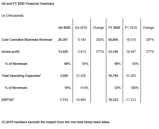 - Gross profit on core cannabis revenues was $13.4 million in Q4 2020, an increase of 377% compared to $2.8 million in Q4 2019.