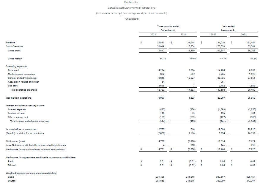 NORWOOD, Mass., March 01, 2023 (GLOBE NEWSWIRE) — MariMed Inc. (“MariMed” or the “Company”) (CSE: MRMD) (OTCQX: MRMD), a leading multi-state cannabis operator focused on improving lives every day, today announced its financial results for the fourth quarter and full year ended December 31, 2022.